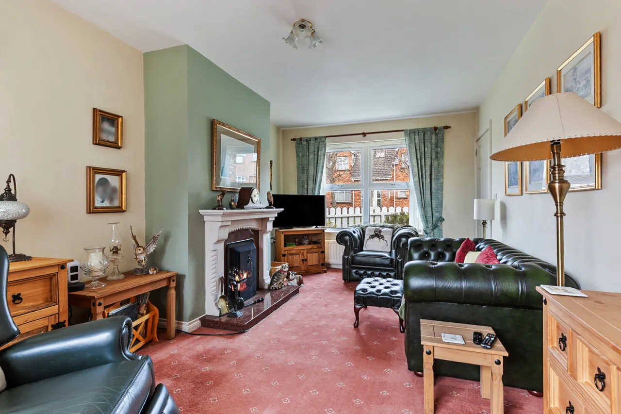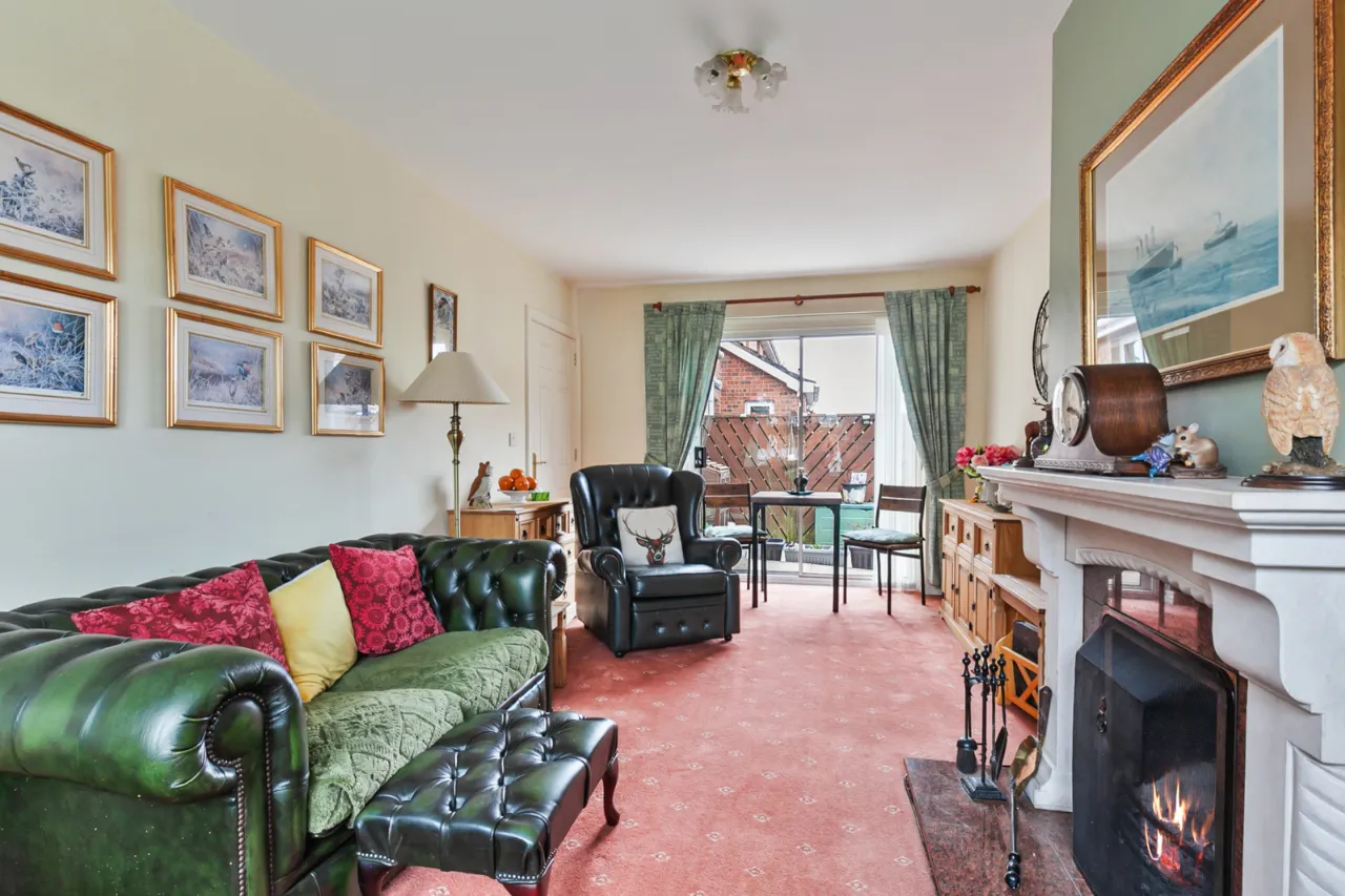 Feature marble fireplace surround with granite inset and hearth, open fire, dual aspect, patio doors to rear.