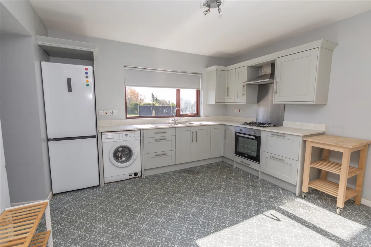The kitchen is fitted with a range of upper and lower units, complemented by a laminate work surface. It features a one and a half bowl stainless steel sink with drainer. Integrated appliances include a four-ring gas hob, electric oven, and extractor hood above. There is space for a fridge freezer and washing machine. A built-in storage cupboard houses the hot water tank, and a double radiator completes the space.