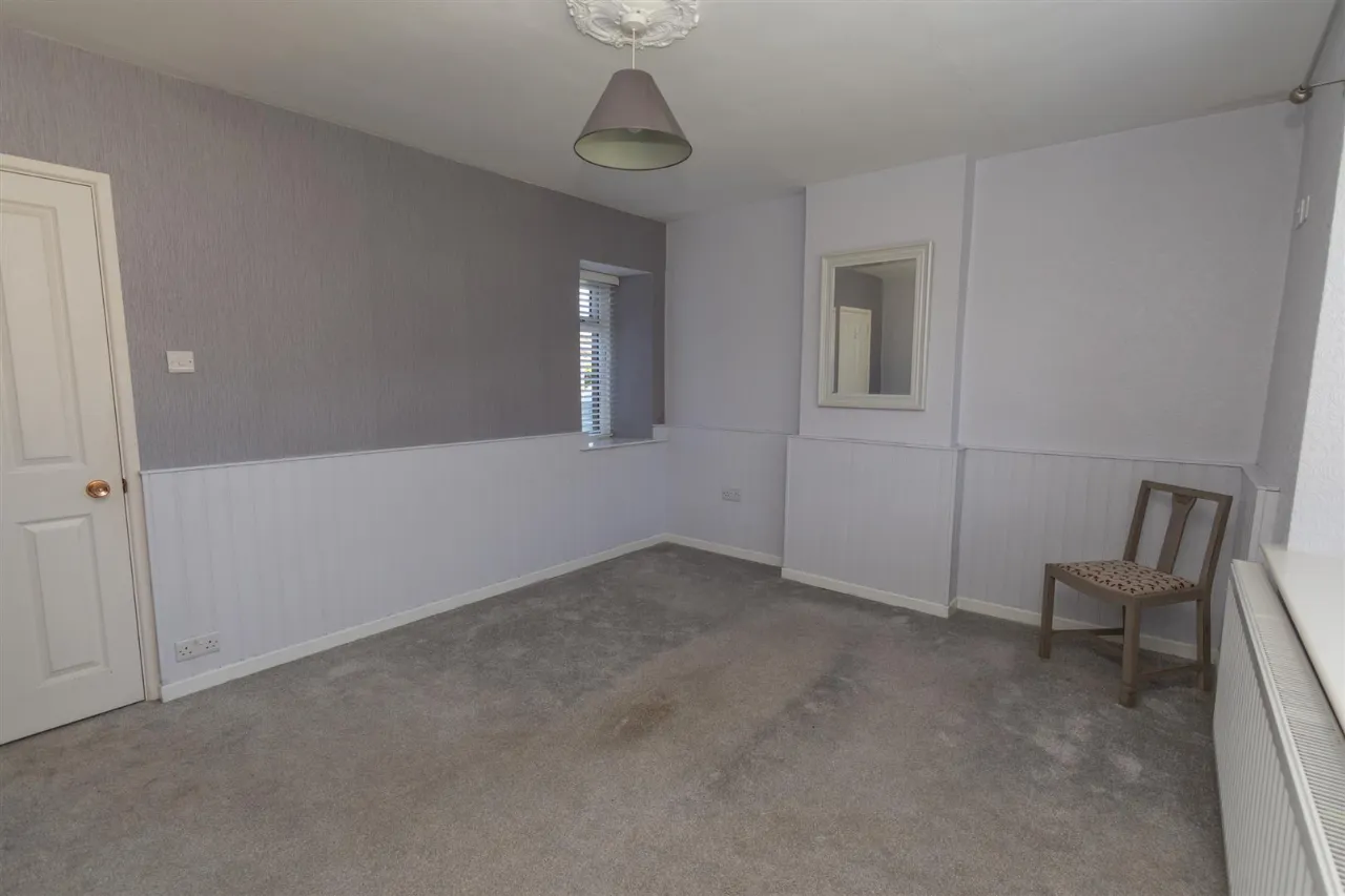 Bedroom One overlooks Newcastle Road and is finished with carpet flooring. It includes a double radiator and a decorative ceiling rose, adding character to the space.
