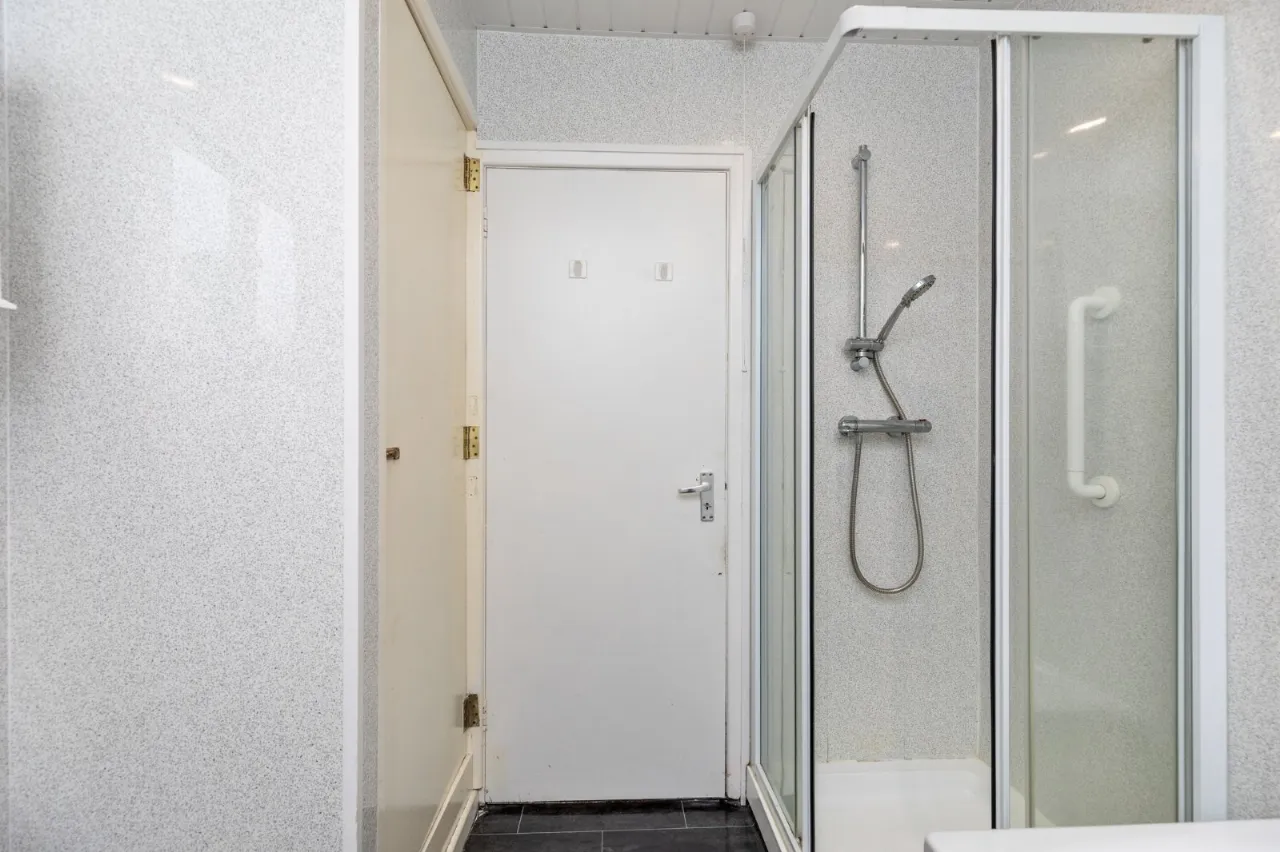 White suite comprising: Panelled bath, shower cubicle with thermostatic shower, pedestal wash hand basin, low flush WC.