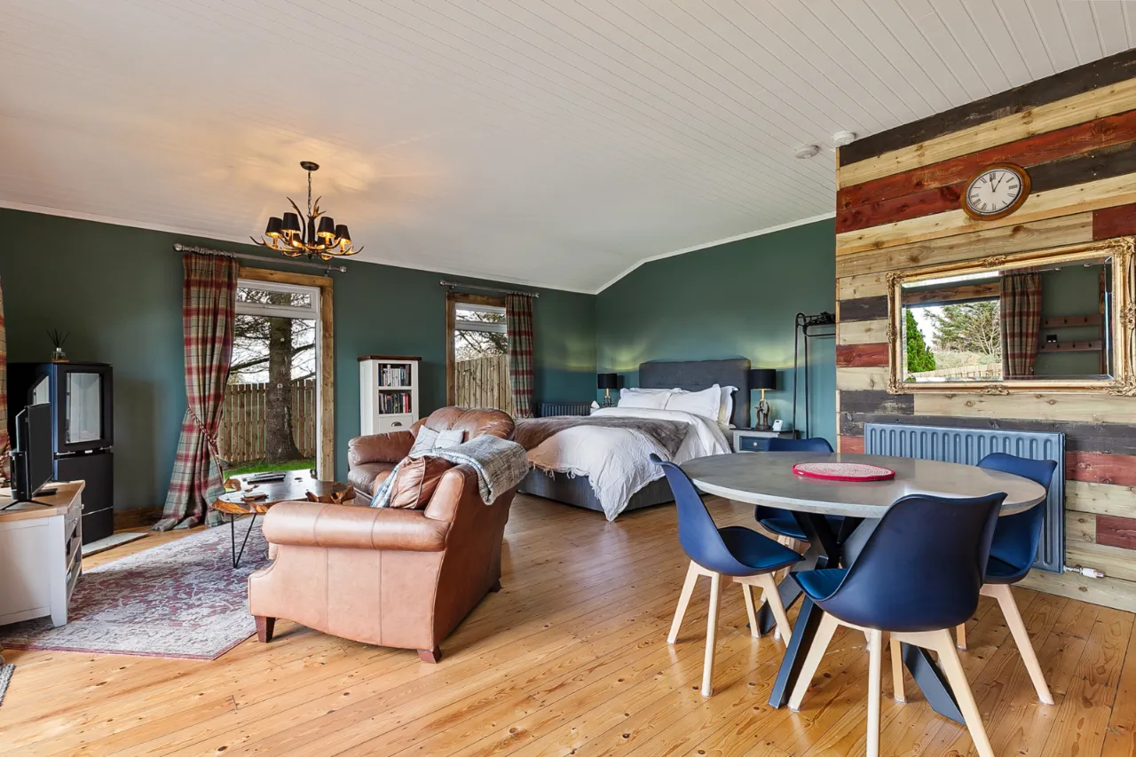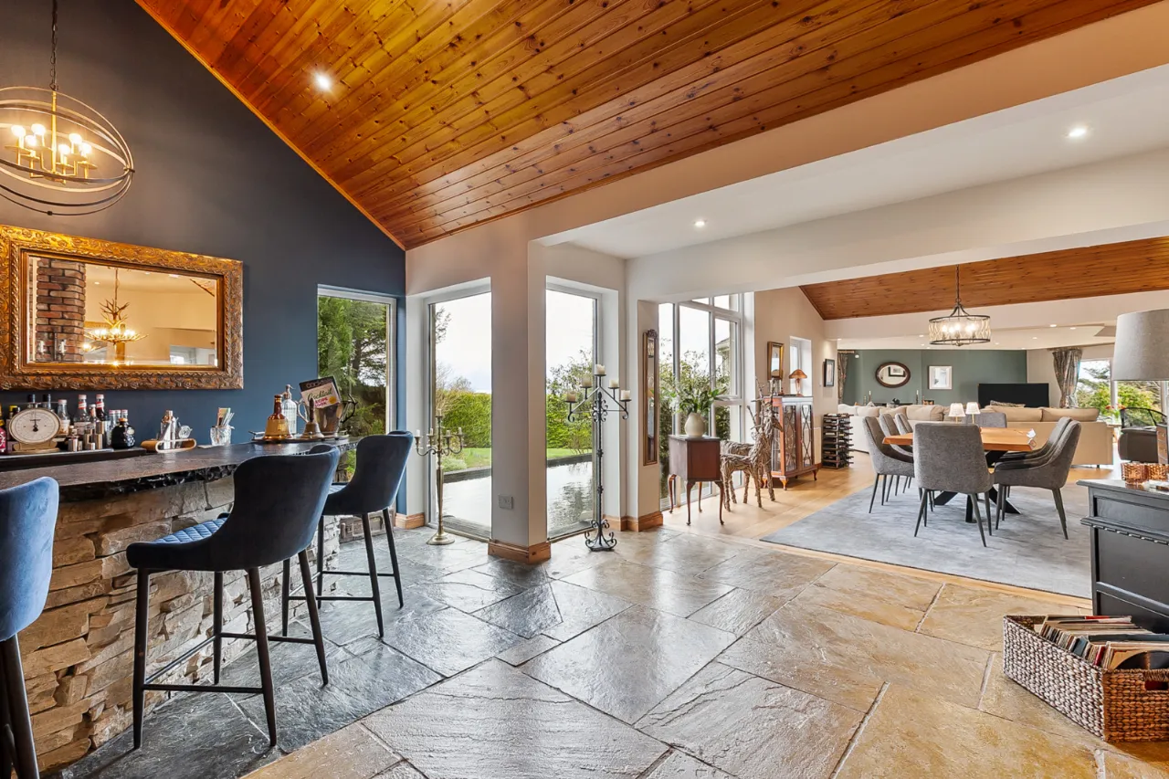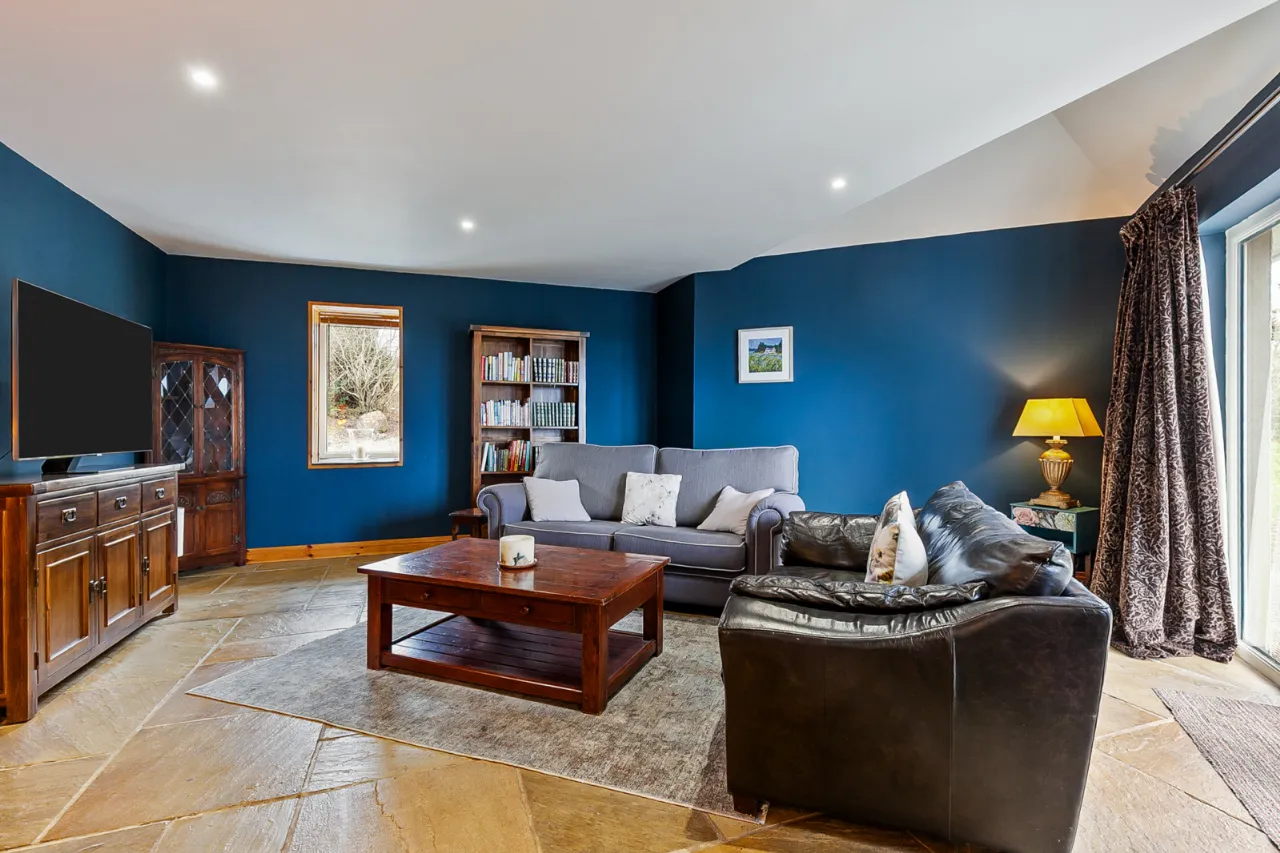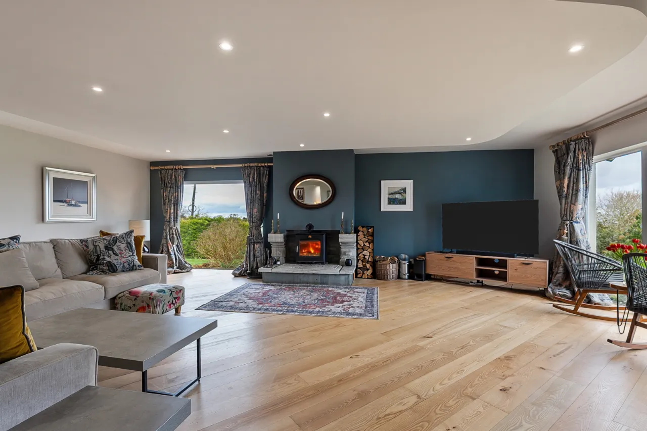 Mourne 12.5 KW multi fuel stove on raised stone plinth, ash wood floor, dual aspect with views over surrounding countryside to Ballycastle, Portstewart and Portrush. Open to: