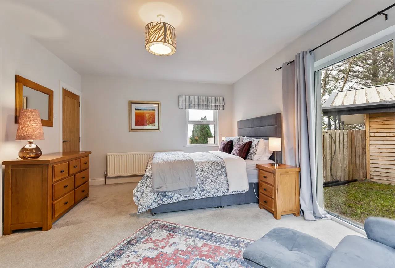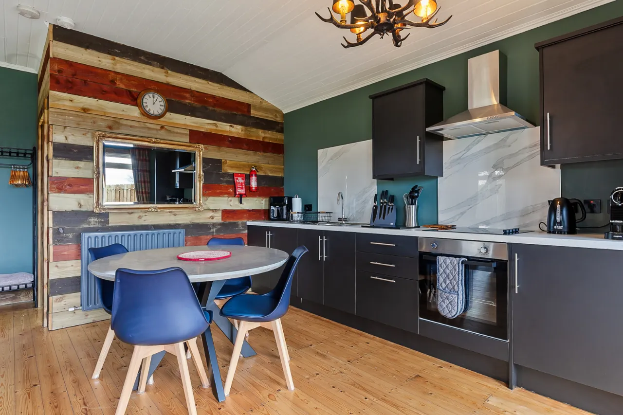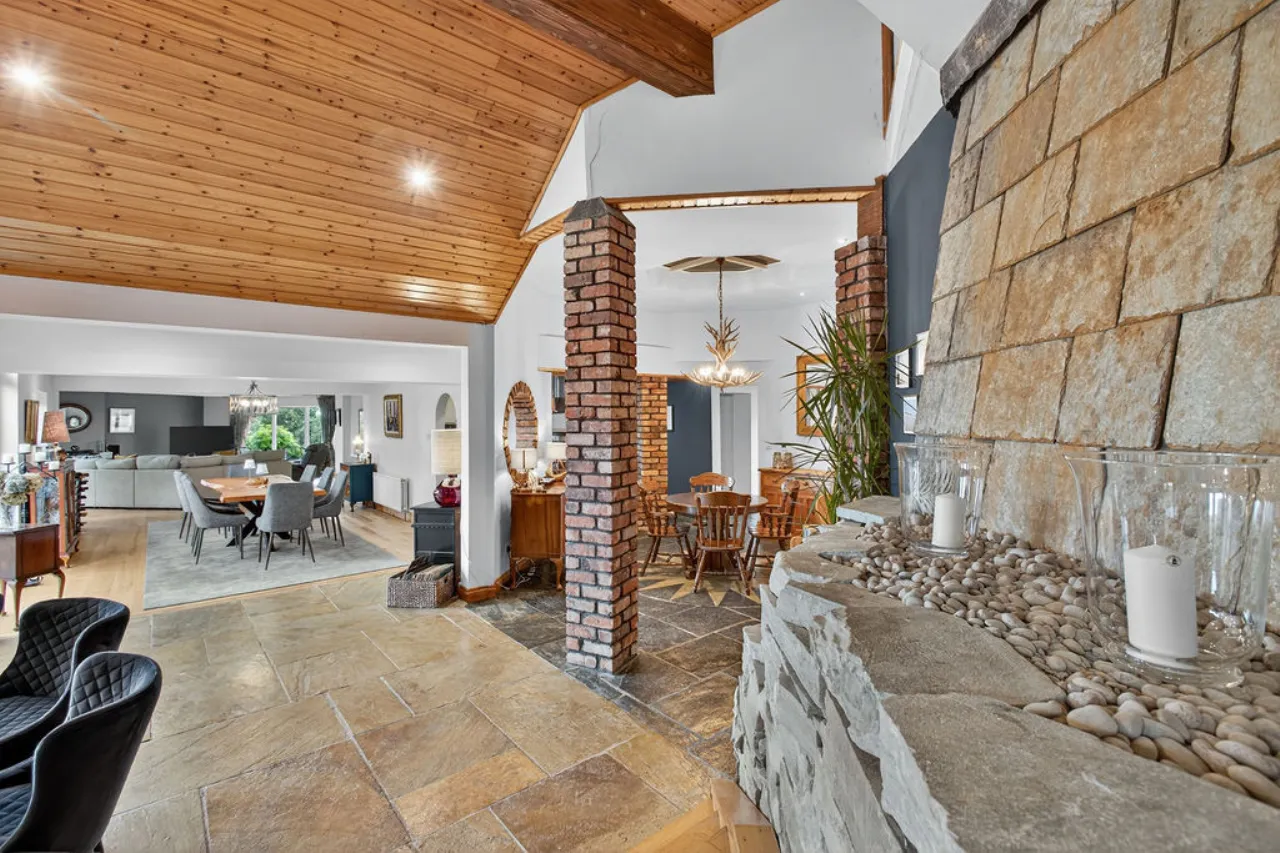 Mourne 12.5 KW multi fuel stove on raised stone plinth, ash wood floor, dual aspect with views over surrounding countryside to Ballycastle, Portstewart and Portrush. Open to: