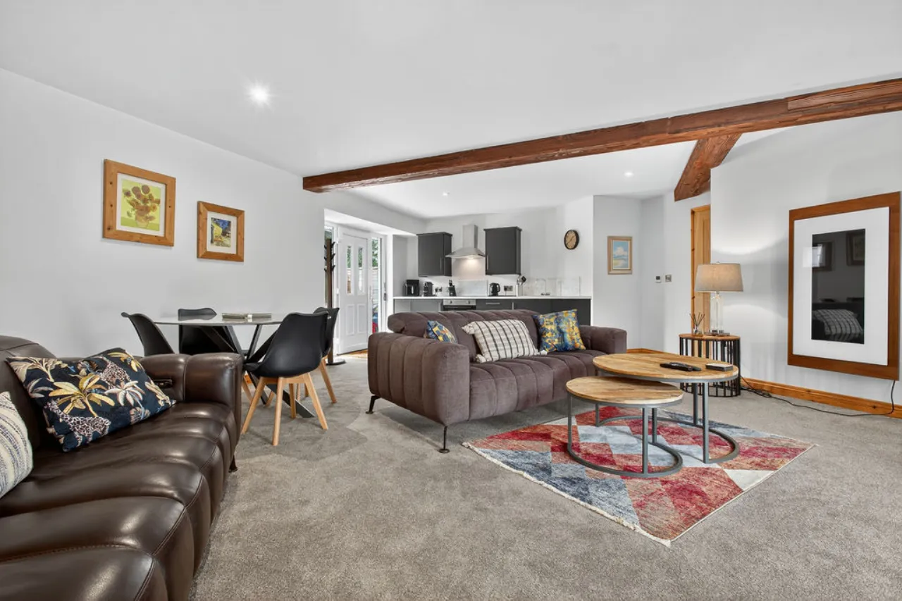 Kitchen Area: Full range of high and low level units, 4 ring induction hob and under oven, stainless steel sink unit with mixer taps, fridge with ice box, slate tiled floor.