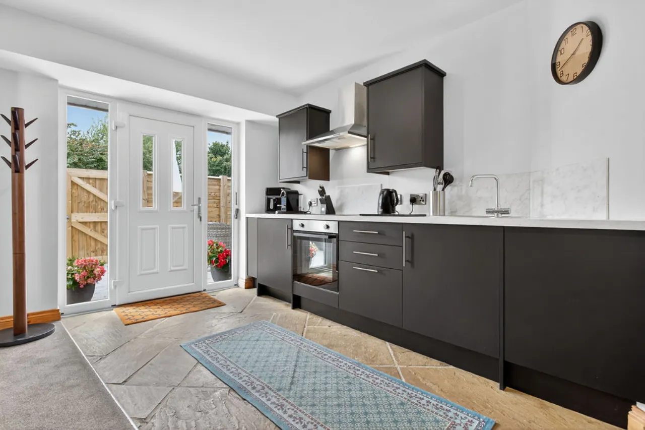 Full range of units, stainless steel single drainer sink unit with mixer taps, plumbed for washing machine, under stairs storage, pressurised tank heated by solar.