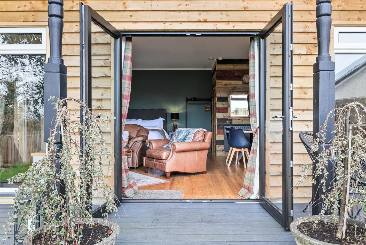 Slate floor, French double doors leading to decking overlooking pond.
