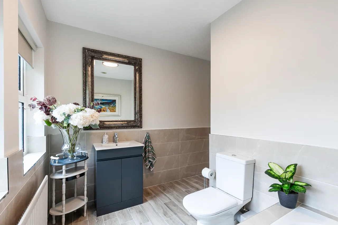 Fully tiled shower cubicle with thermostatic shower, low flush WC, vanity unit with mixer taps, partly tiled walls.