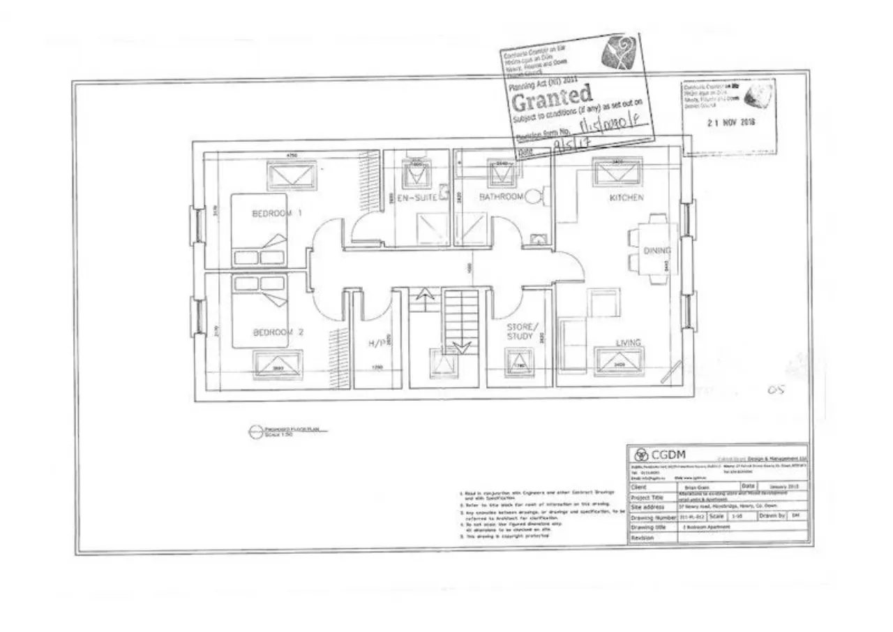 Planning permission was granted under Planning Application P/2015/0090/F on 9th May 2017. On completion each of the retail units will extend to circa 387sq.ft whilst the the apartment will comprise a Kitchen/Living Area, Bathroom, 2 Bedrooms (1 en-suite) and home office. (It should be noted that the end garage does not form part of the re-development plot).