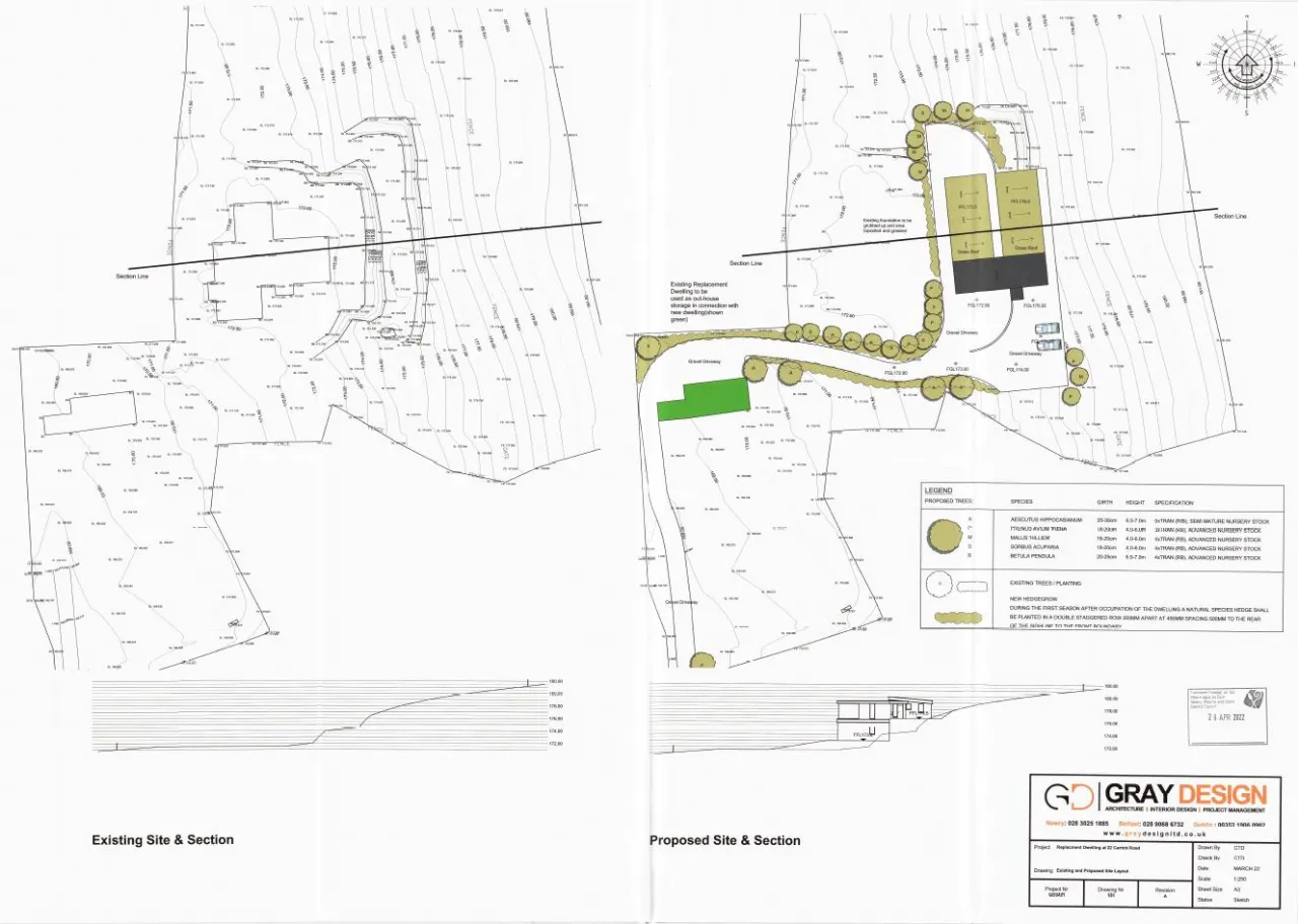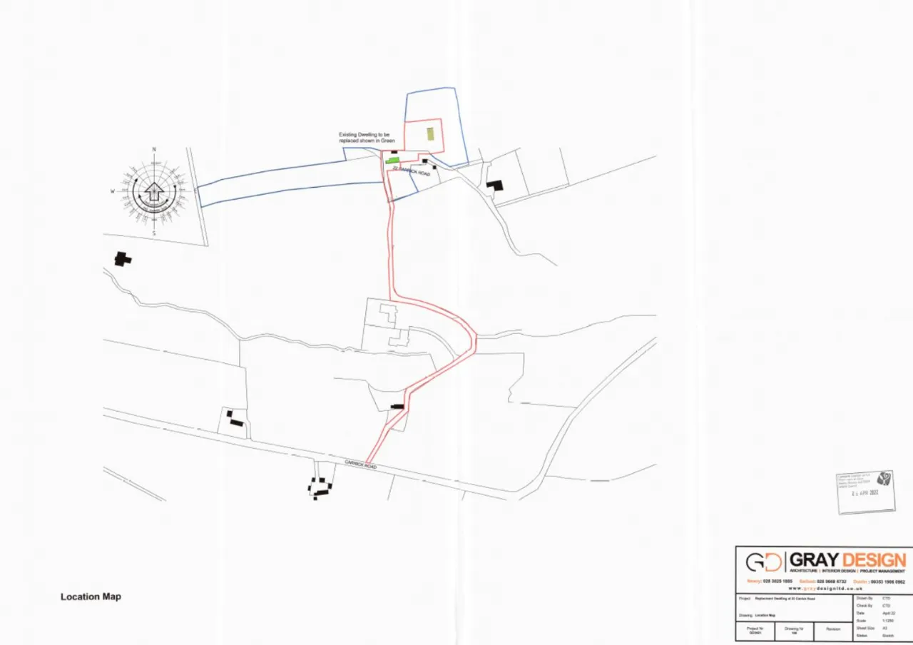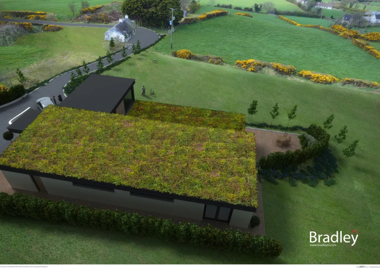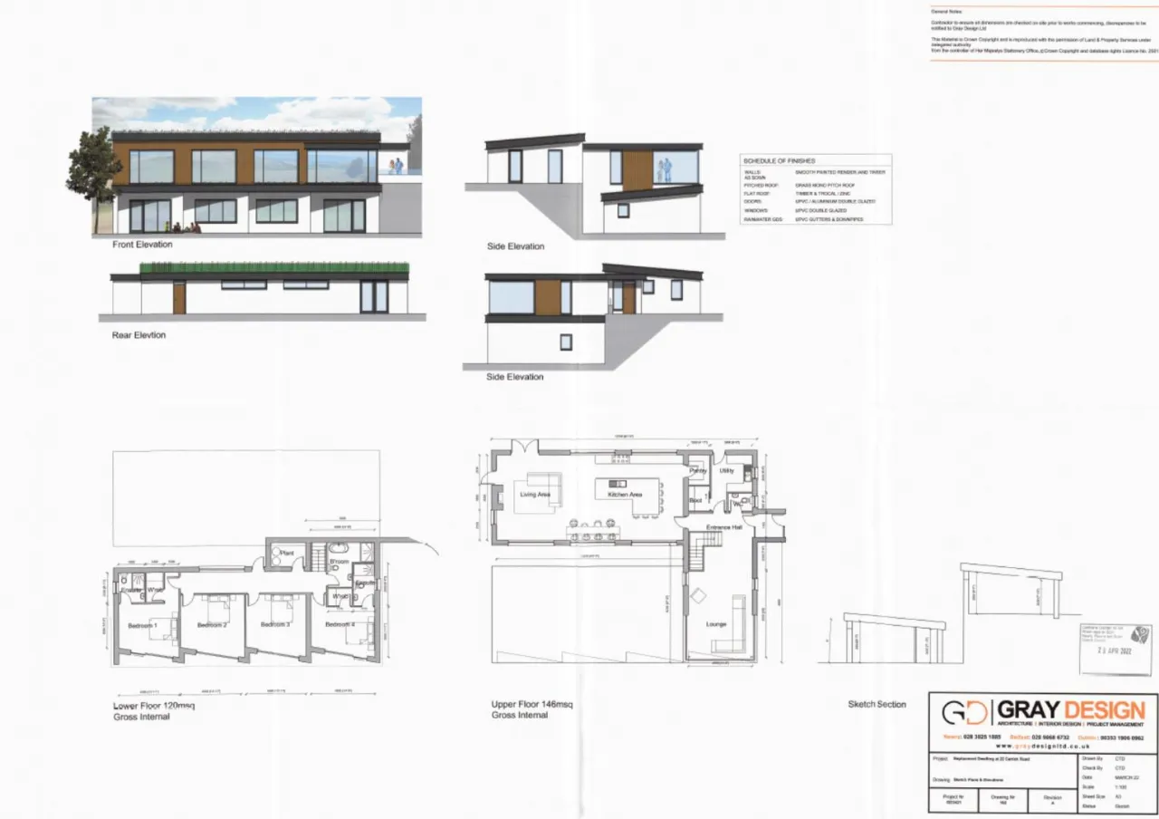 Nestled in a prime elevated position with stunning, expansive views across Tamnaharry and Burren, this site with full planning permission (LA07/2022/0709/F) offers a rare opportunity to create your dream family home in a private countryside setting. The proposed dwelling has been thoughtfully designed to complement its natural surroundings, with a sleek, contemporary design and eco-friendly finishes, including a grass-covered roof and large expanses of glazing to embrace the breathtaking west-facing aspect.