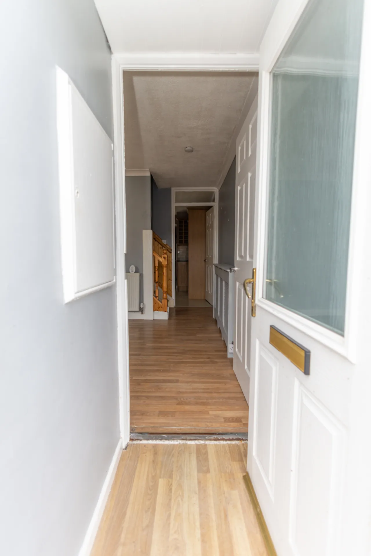 Laminate flooring, electric meter board, and panelled ceiling, leading through to the living area.