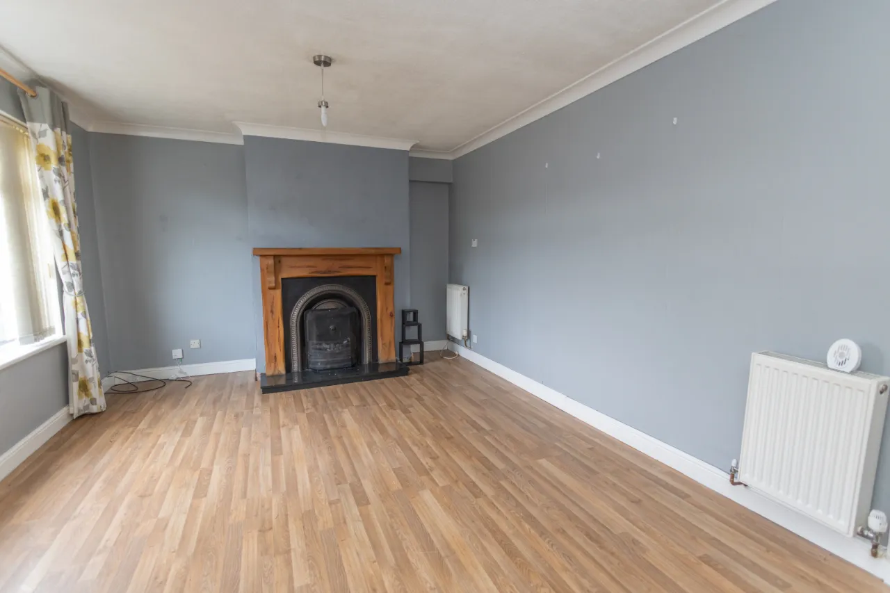 Reception room with laminate flooring, open fire featuring a wooden surround, cast iron inset and polished granite hearth, and three double panel radiators, providing a warm and comfortable family space.