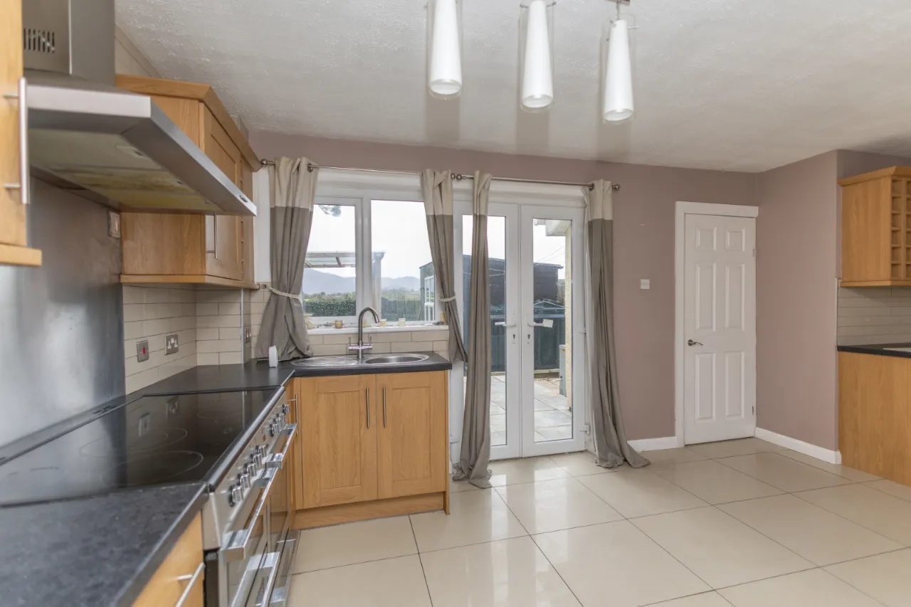 Kitchen and dining area with tiled flooring, a range of upper and lower wooden units with laminate work surfaces and tiled splashback. Includes a Flavel range-style electric cooker, with space for a washing machine and fridge freezer. Features a round stainless steel sink and drainer and double doors opening to the south-west facing rear garden, ideal for entertaining and family living.