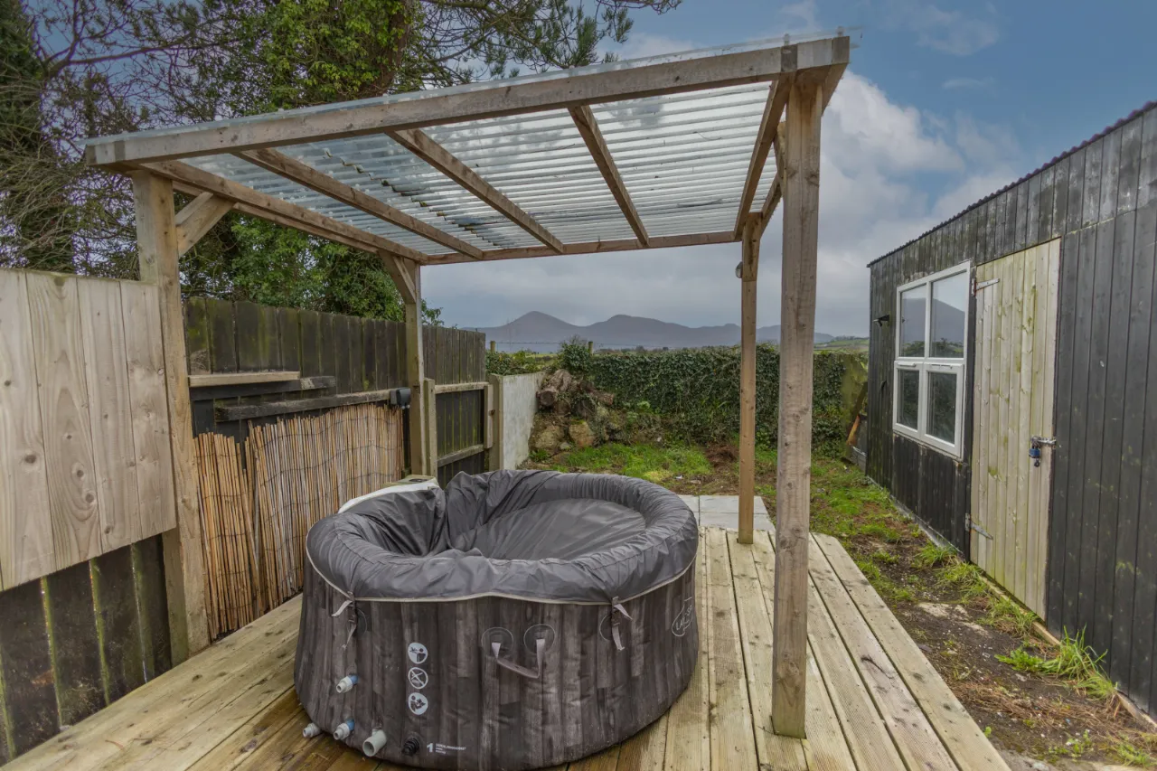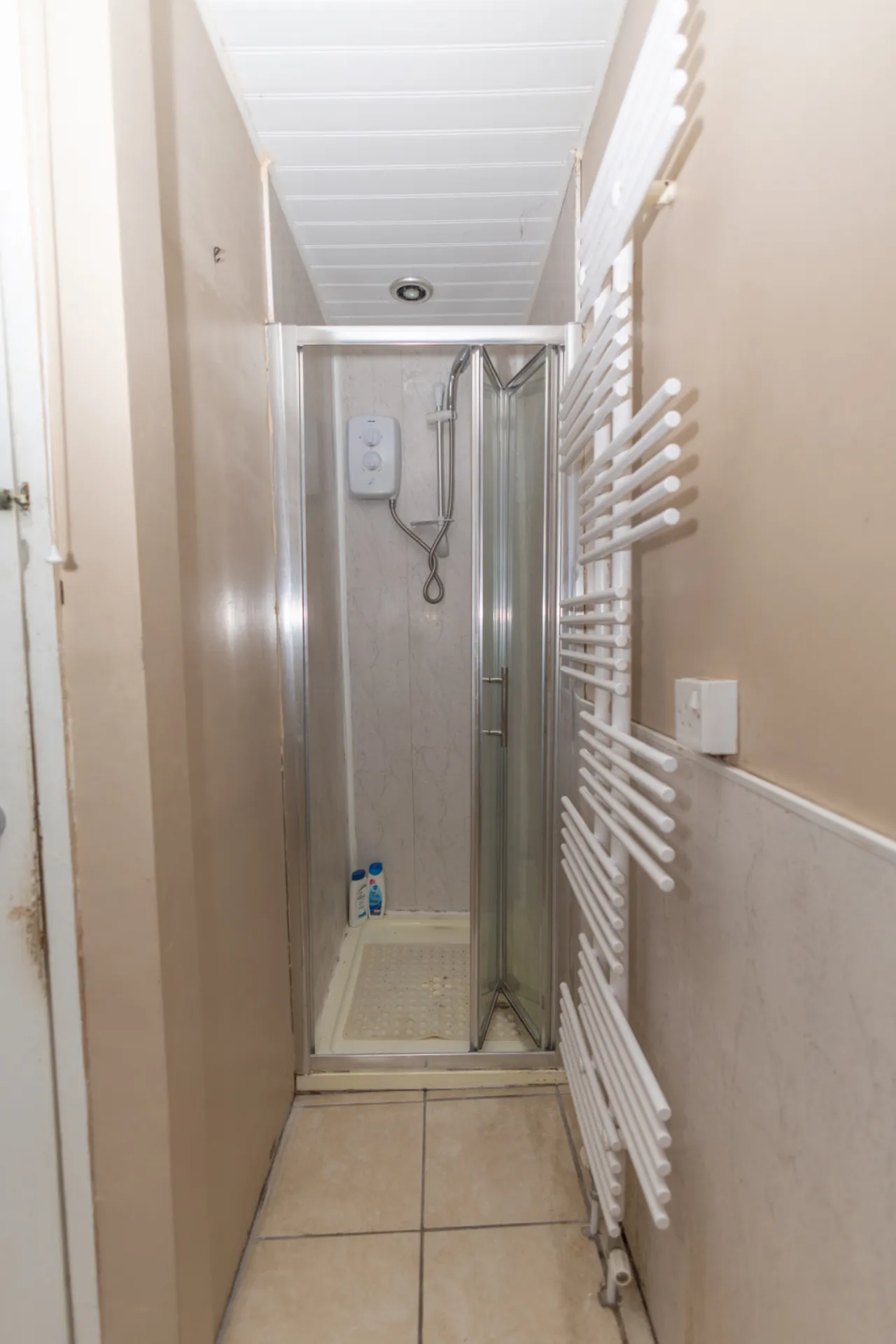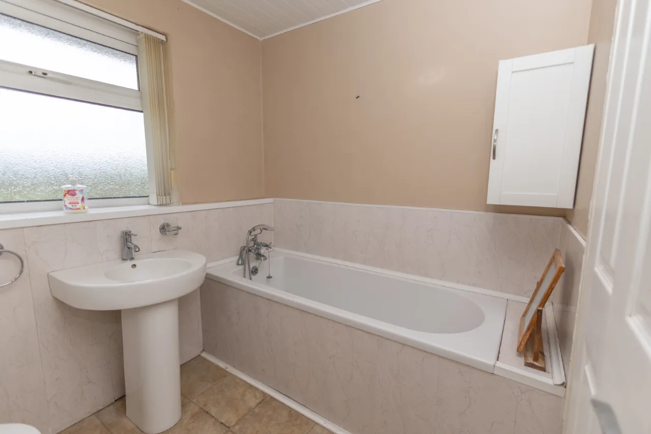 Fitted with tiled flooring and half-tiled walls, featuring a white suite comprising WC, wash hand basin, bath and electric shower. Heated towel rail.