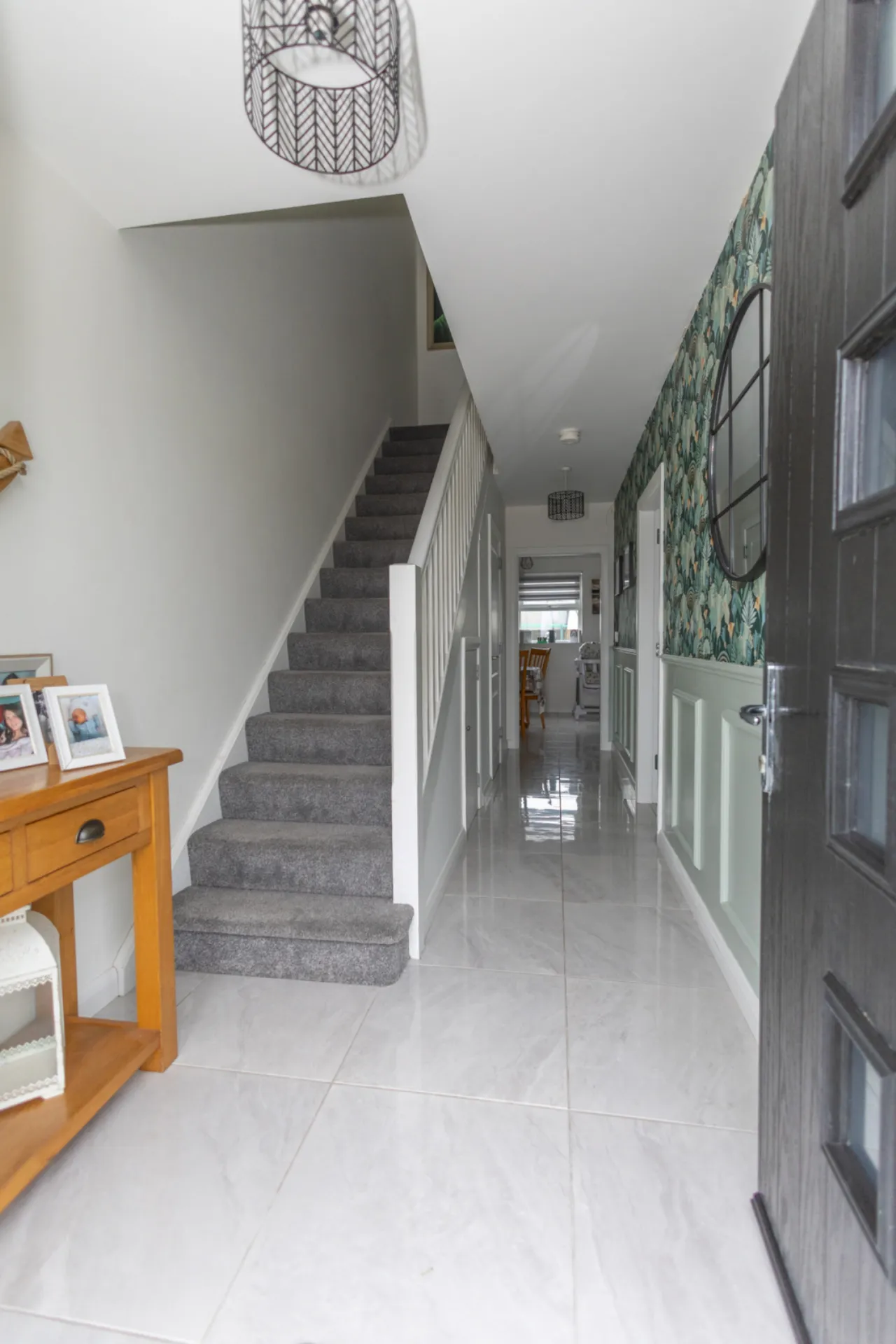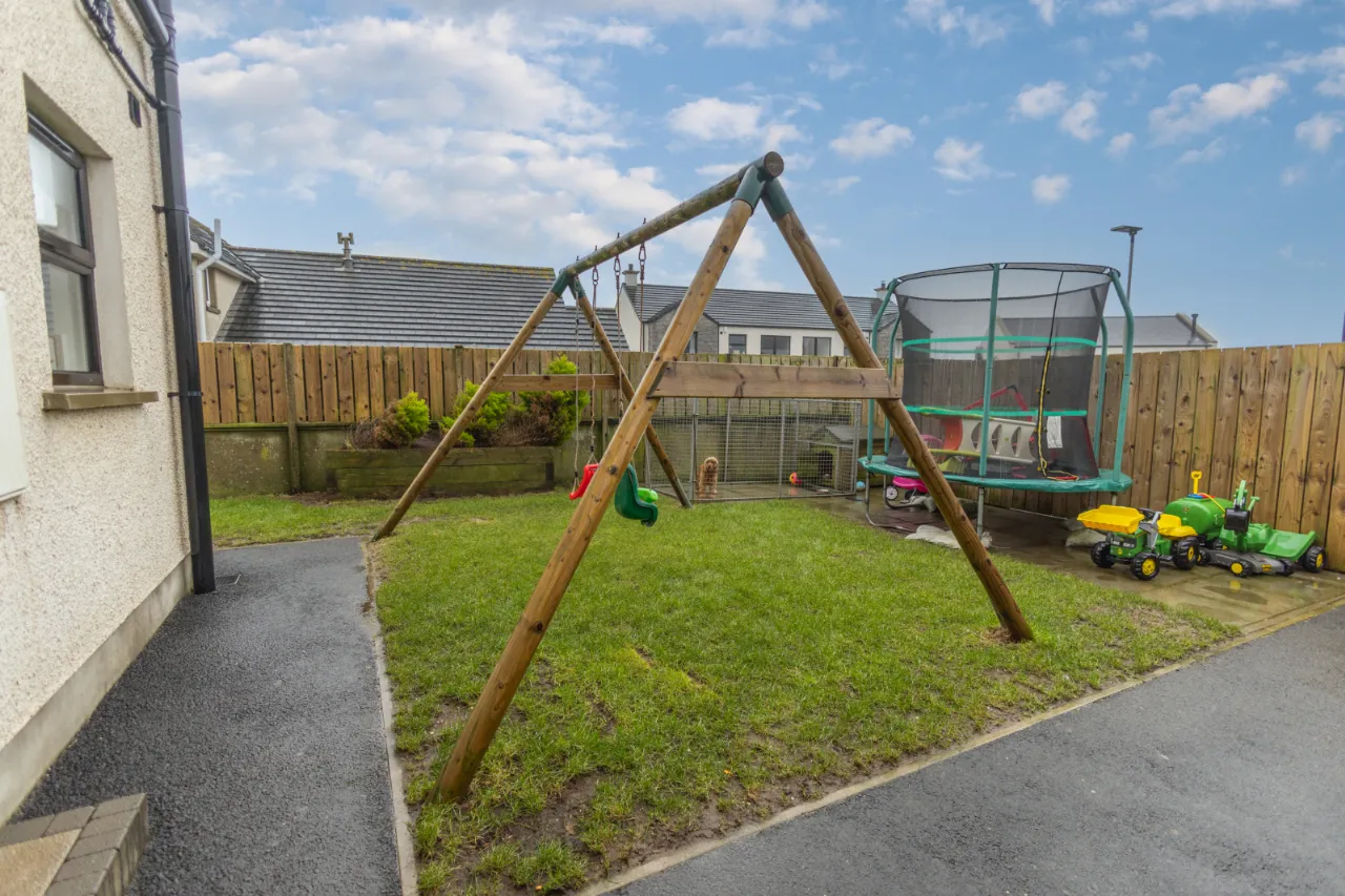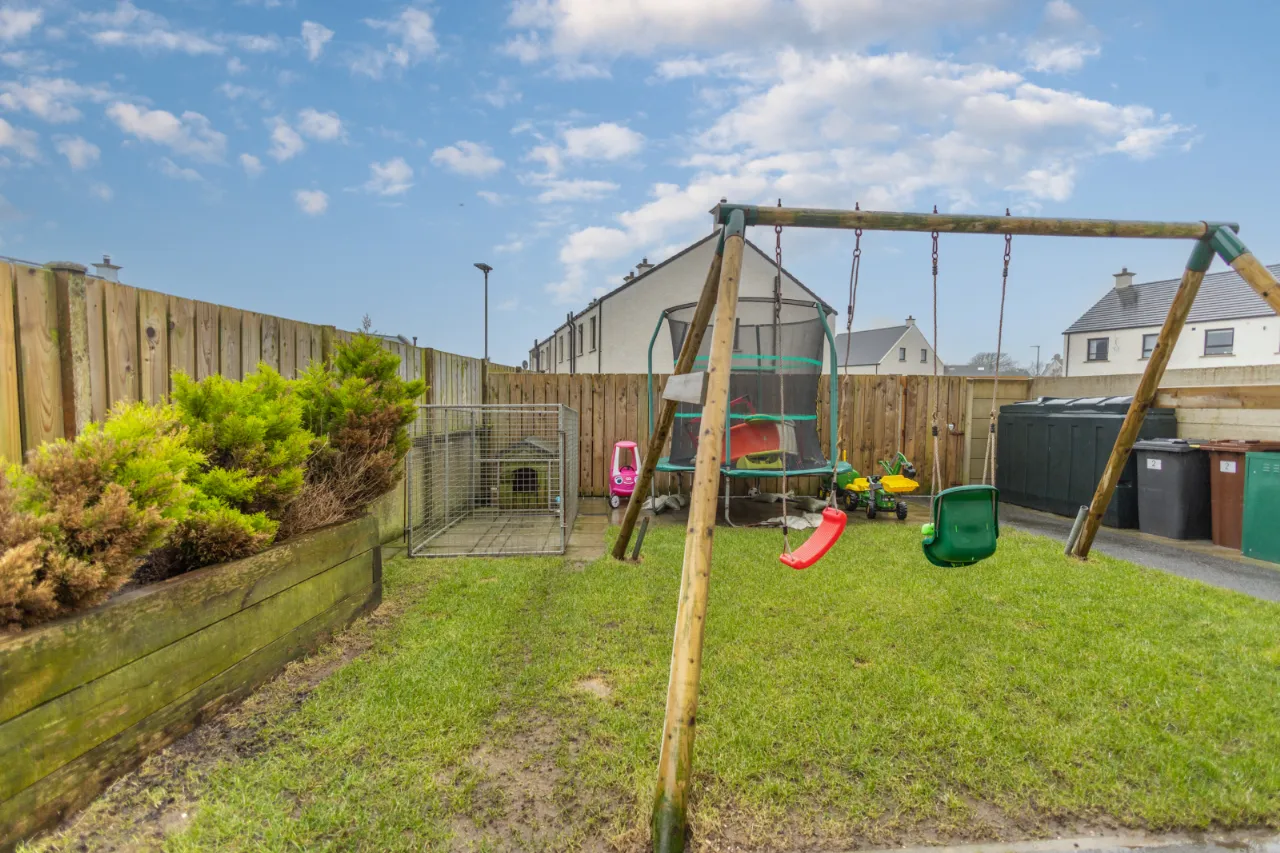 Front and side gardens laid in lawn with paved pathway leading to the front door. To the rear, a tarmac area provides parking for two cars, along with an enclosed lawned garden and paved patio area.