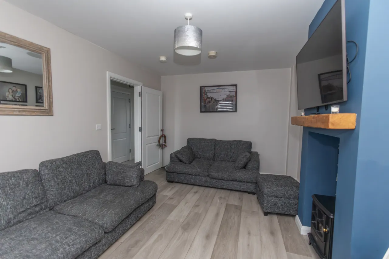 Wood-effect tiled flooring, double radiator, TV point, and door leading to en-suite shower room.