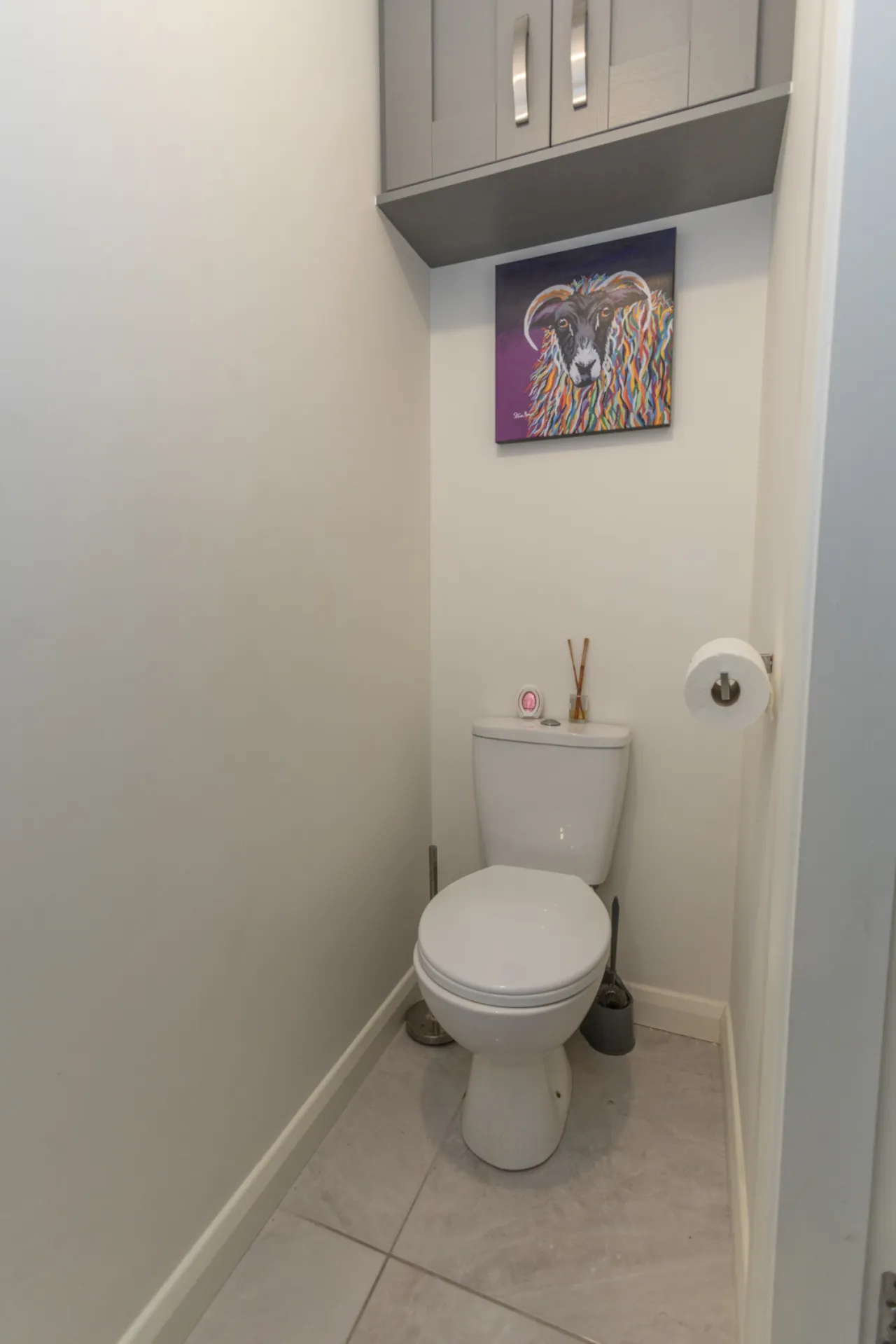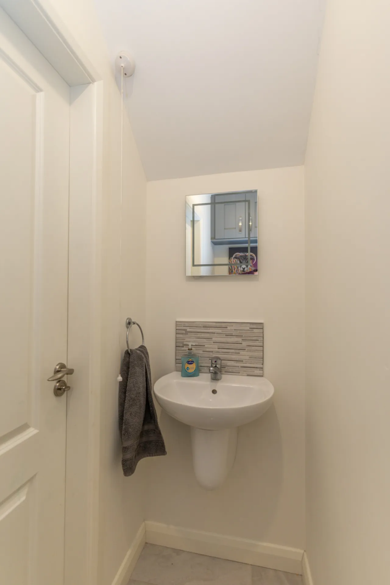 Tiled flooring, white suite with floating wash hand basin, tiled splashback, wall-mounted mirror above, and a high-level cupboard housing the fuse board.