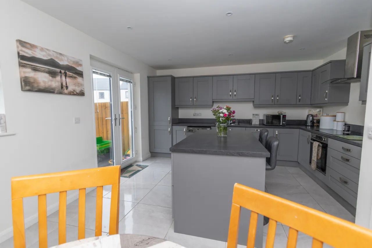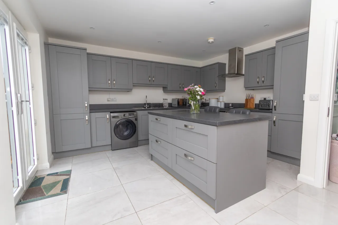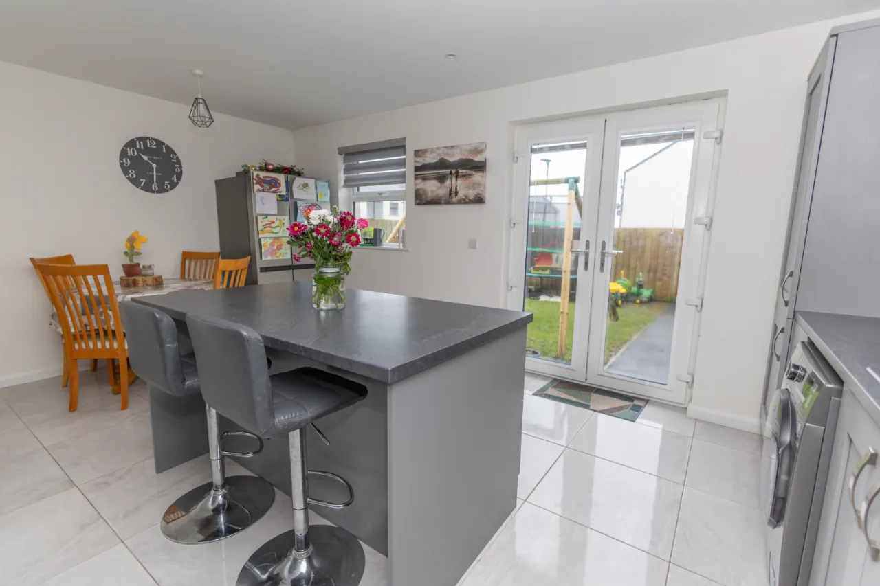 Tiled flooring with a range of upper and lower units complemented by laminate work surfaces. Integrated appliances include a Beko dishwasher and electric hob with oven and extractor hood above. Space is provided for a fridge freezer and washing machine. Feature island unit with breakfast bar and generous drawer storage, along with a TV point.