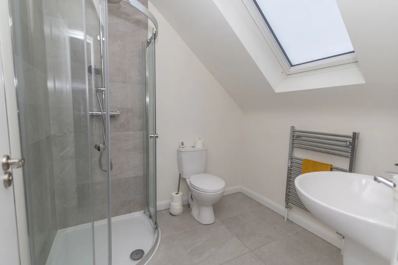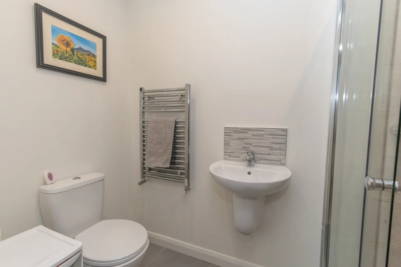 Tiled flooring with white suite comprising WC and wash hand basin with tiled splashback. Corner mains shower unit, tiled behind. Wall-mounted heated towel rail and recessed spotlighting.