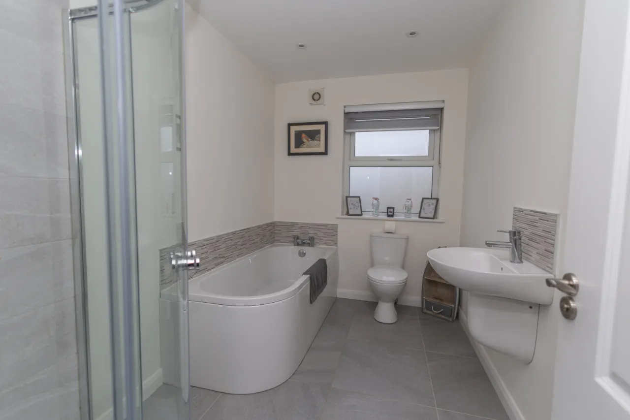 Tiled flooring with white suite comprising WC and wash hand basin with tiled splashback. Rounded-edge bath with corner mains shower unit and tiled surround. Wall-mounted heated towel rail and recessed spotlighting.