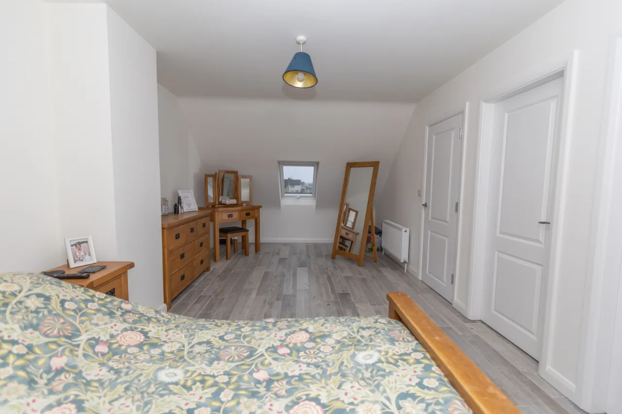 Wood-effect tiled flooring, double radiator and TV point. Storage under the eaves. Walk in wardrobe with hanging space and carpet flooring.