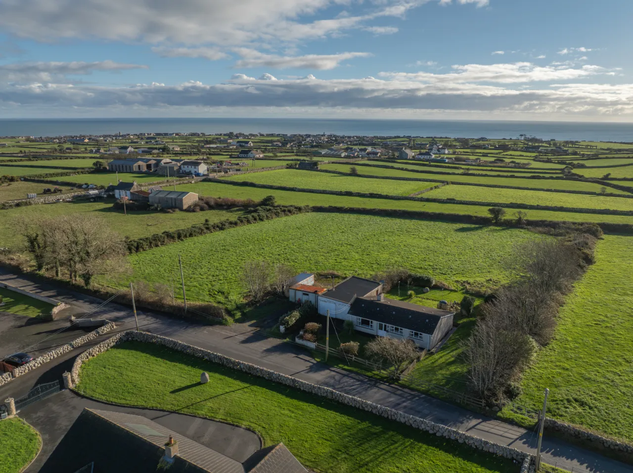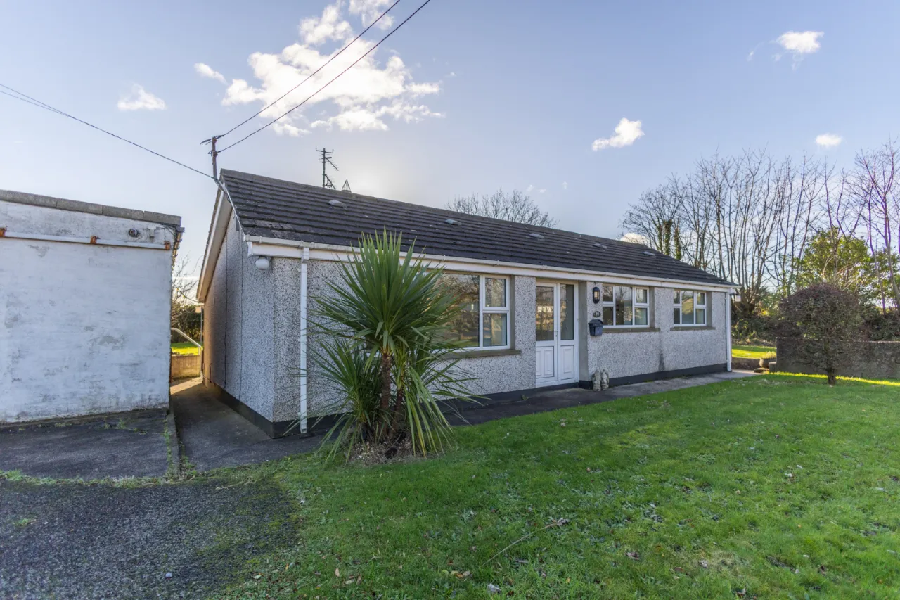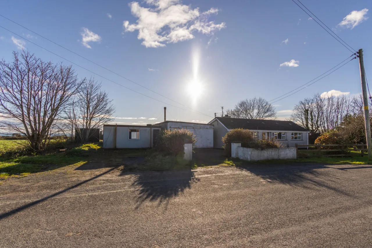 Exterior with front and rear garden laid in lawn, a small well to the side, and a detached concrete storage unit with electricity, plumbing, and drainage. Off-street parking.