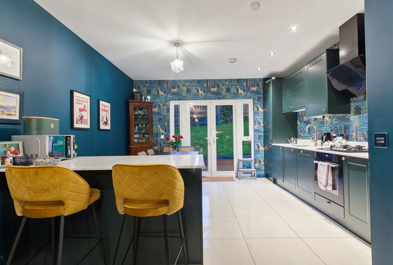Excellent range of high and low level Quartz work tops, one and a half bowl sink unit with mixer tap, four ring gas hob and overhead extractor hood. Under bench oven, integrated fridge and freezer, integrated dishwasher, integrated washing machine, breakfast bar for casual dining and hosting. Formal dining space and patio doors to rear garden.