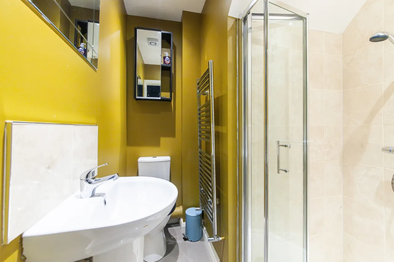 Comprises of enclosed corner shower unit with tiled walls and shower screen, low flush WC, pedestal wash hand basin with mixer tap and tiled splash back. Tiled floor and extractor fan.