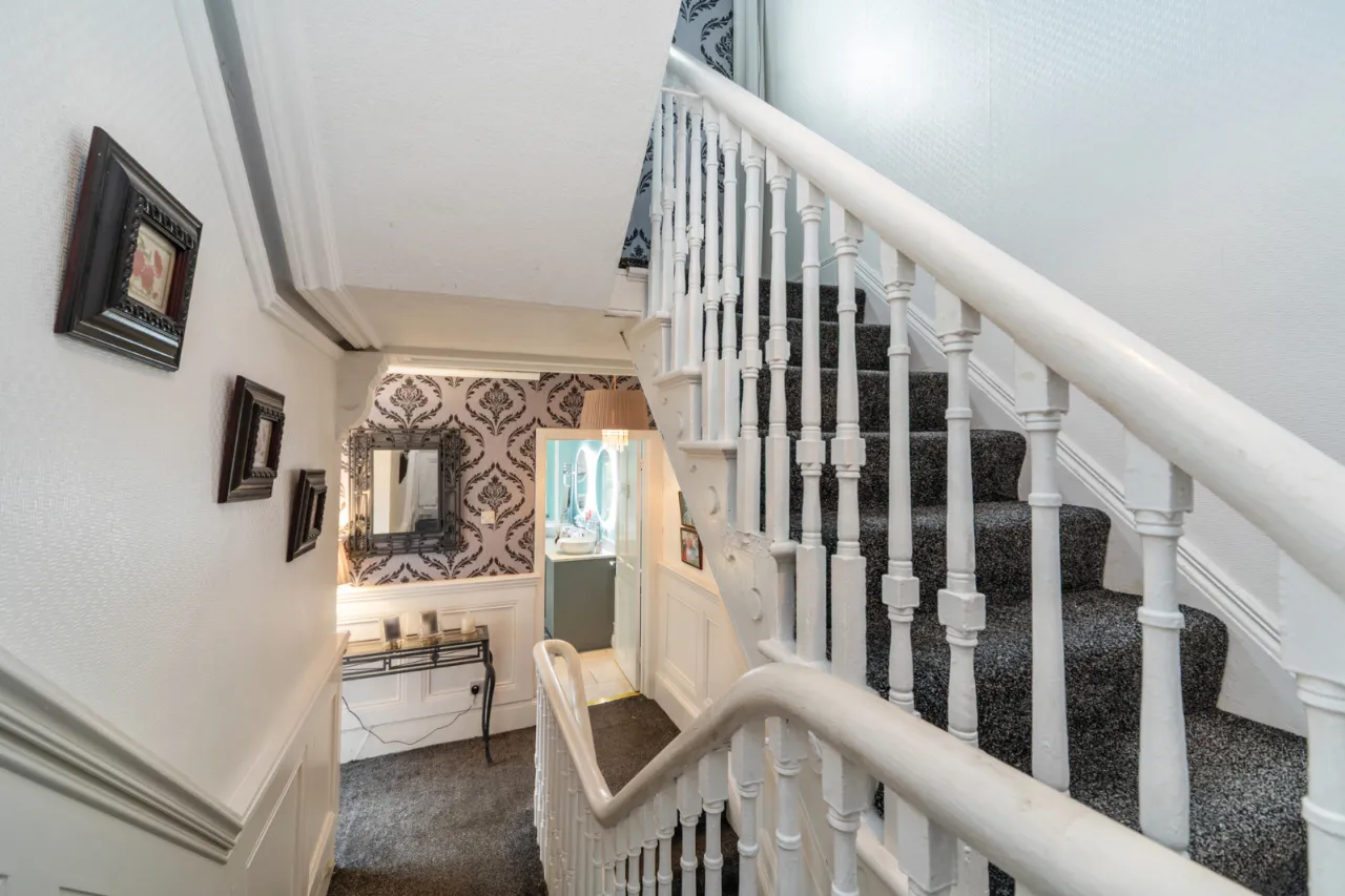 Wall paneling, corniced ceiling, ceiling corbel and access to loft.