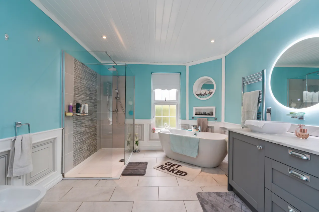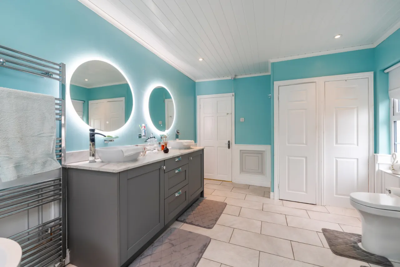 Comprises of free standing bath with mixer tap, walk in shower with glass shower screen and tiled walls. His and hers sink units with mixer taps and large vanity storage unit. Low flush WC with push button flush, bidet with mixer tap, tiled floor, recessed lighting and chrome heated towel rail.