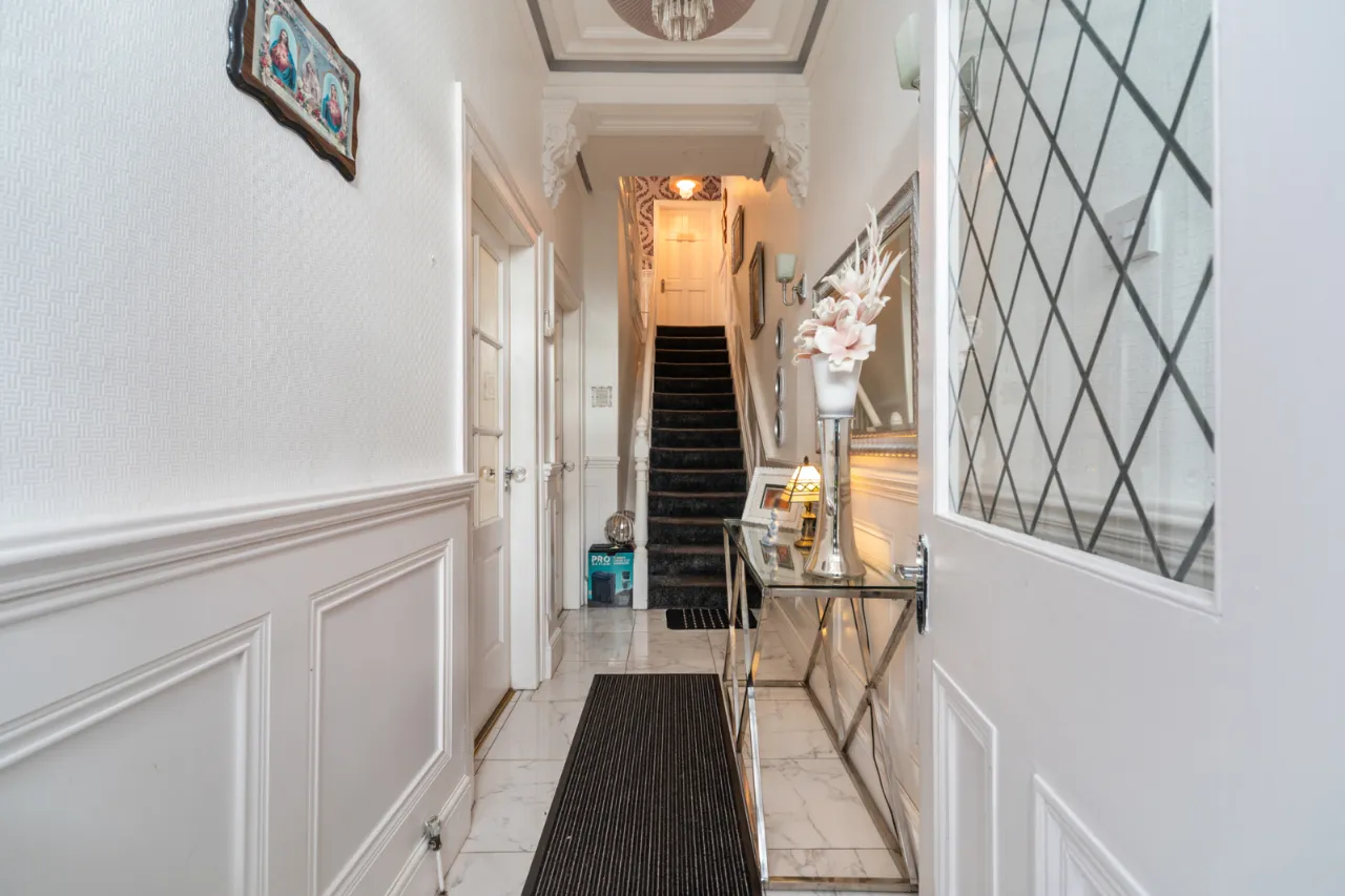 Ceramic tiled floor, wall paneling, corniced ceiling, ceiling corbel and ceiling rose, leading to...