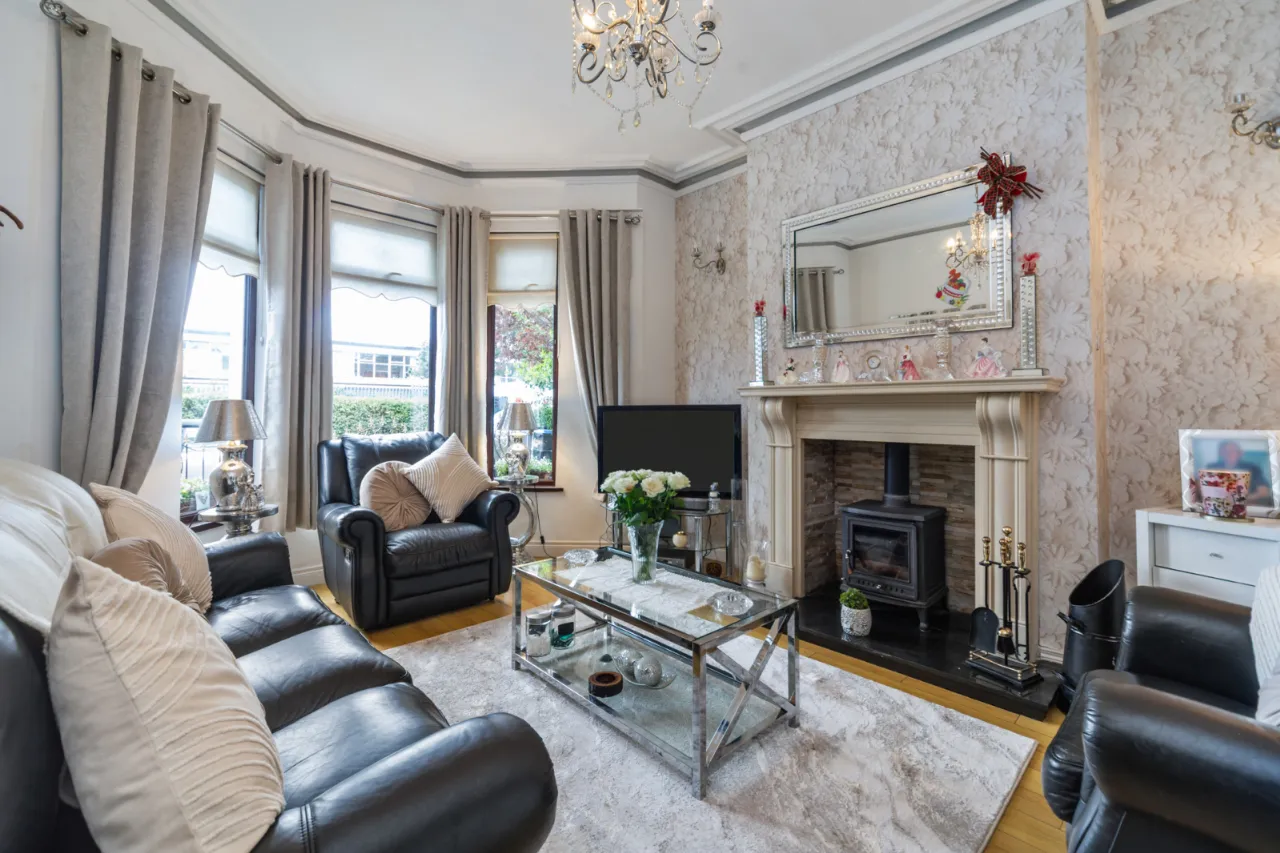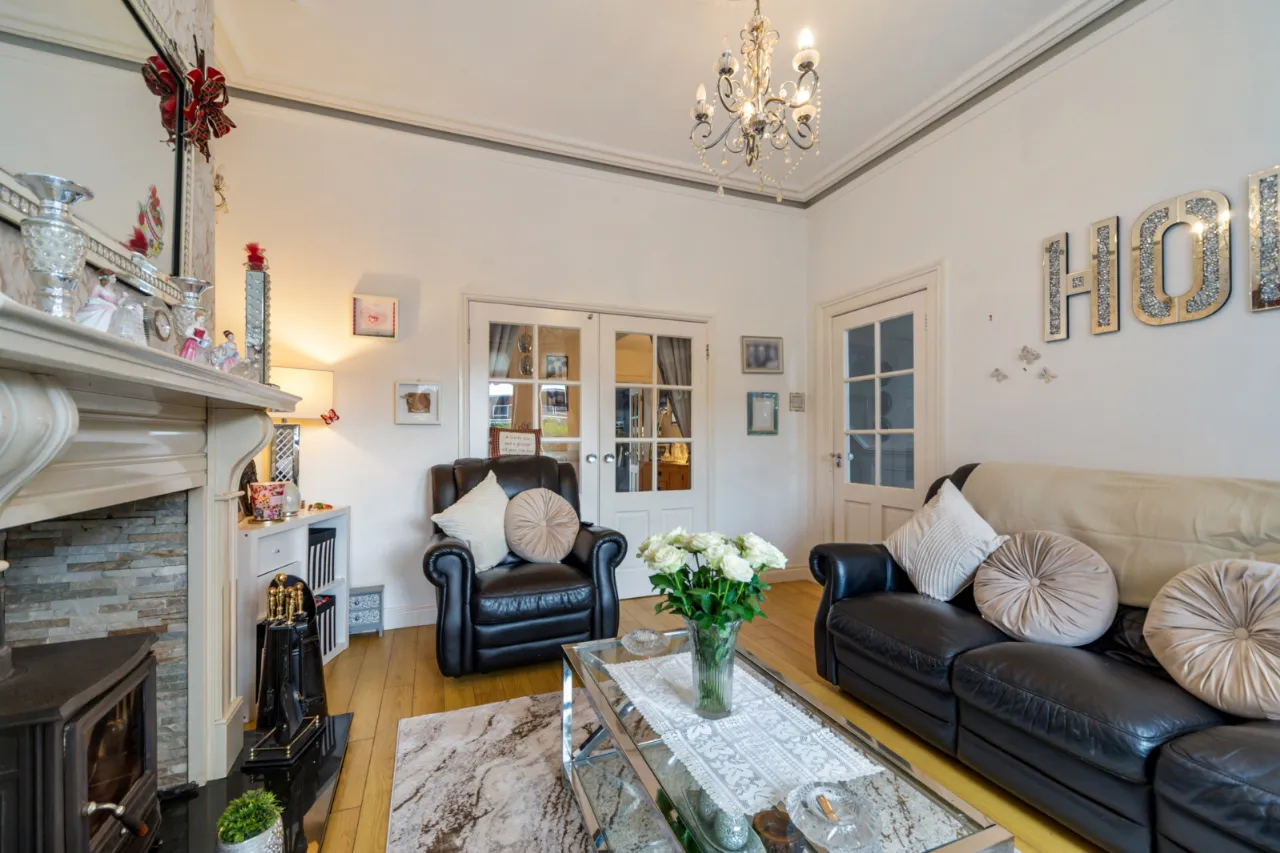Feature bay window, feature fireplace with multi fuel stove, hardwood floor, corniced ceiling, ceiling rose and French door leading to...