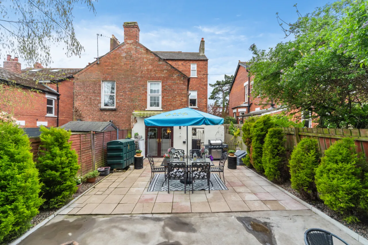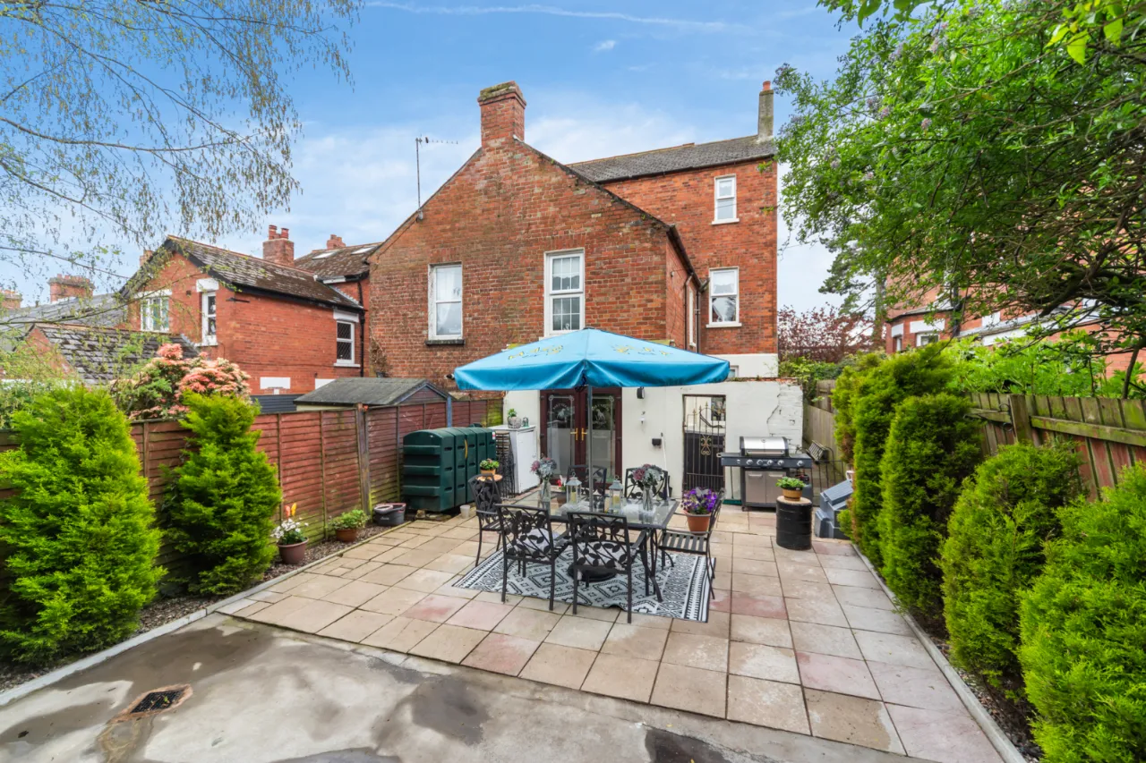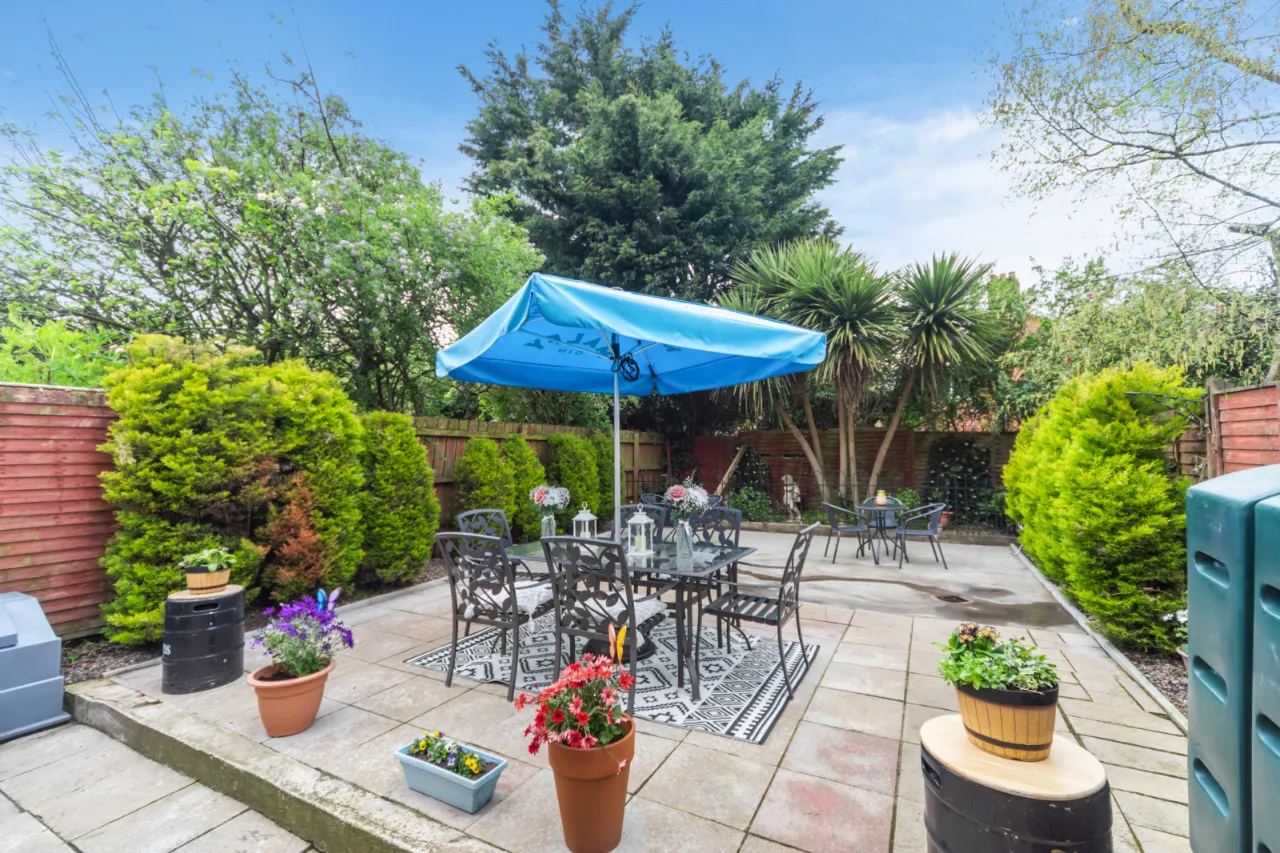 Enclosed rear garden with pleasant range of shrubbery, trees, patio and hedging. Enclosed bin storage, bordering fencing and hedging, outside tap, light and electric points.