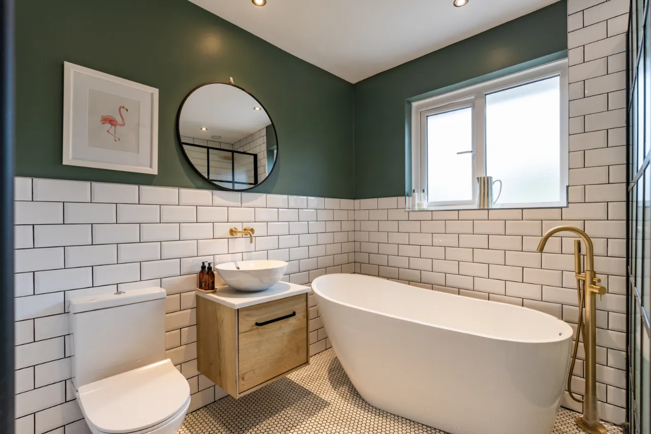 Contemporary Bathroom Suite comprising of free standing bath, walk in shower with inset shelving, ceramic bowl sink unit and wall mounted vanity storage underneath. Low flush WC, heated towel rail, partly tiled wall and tiled floor. Recessed lighting and extractor fan.