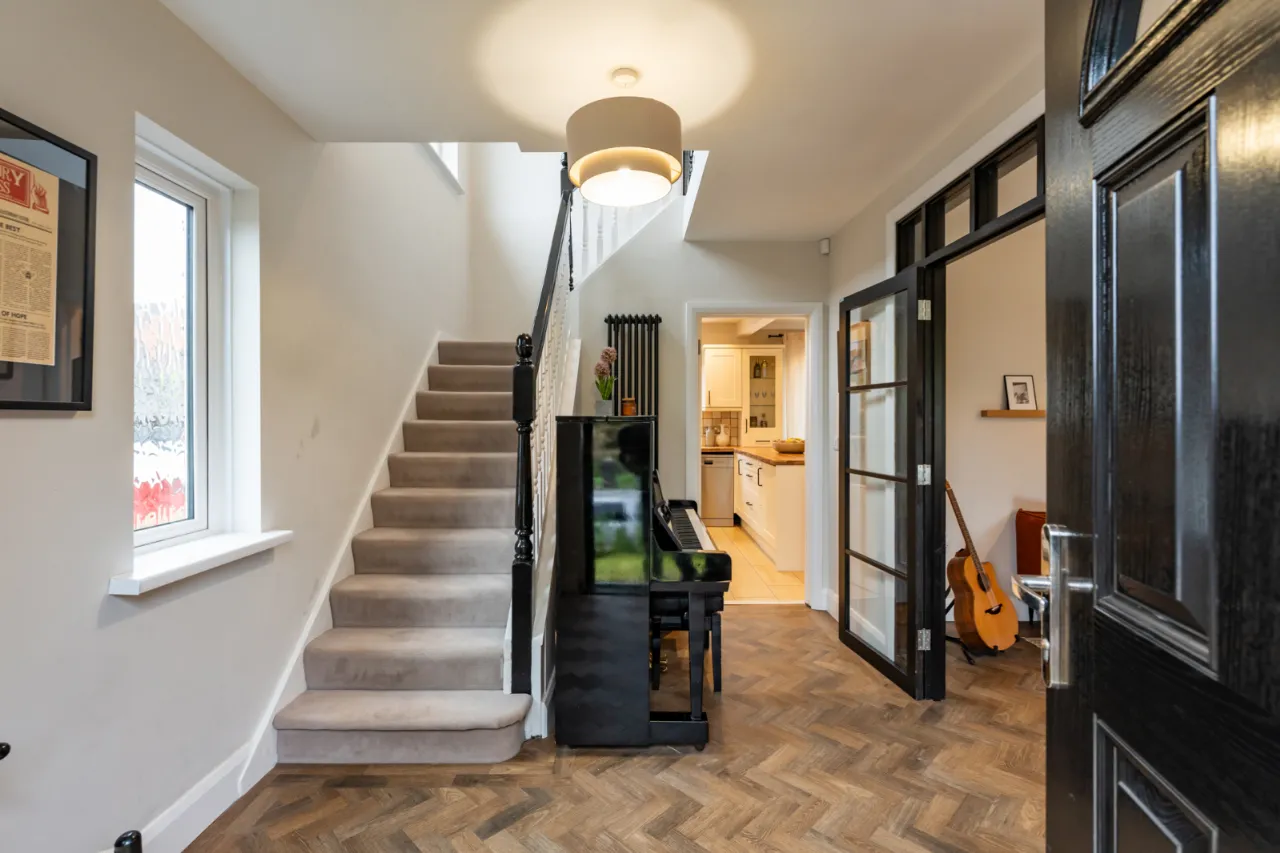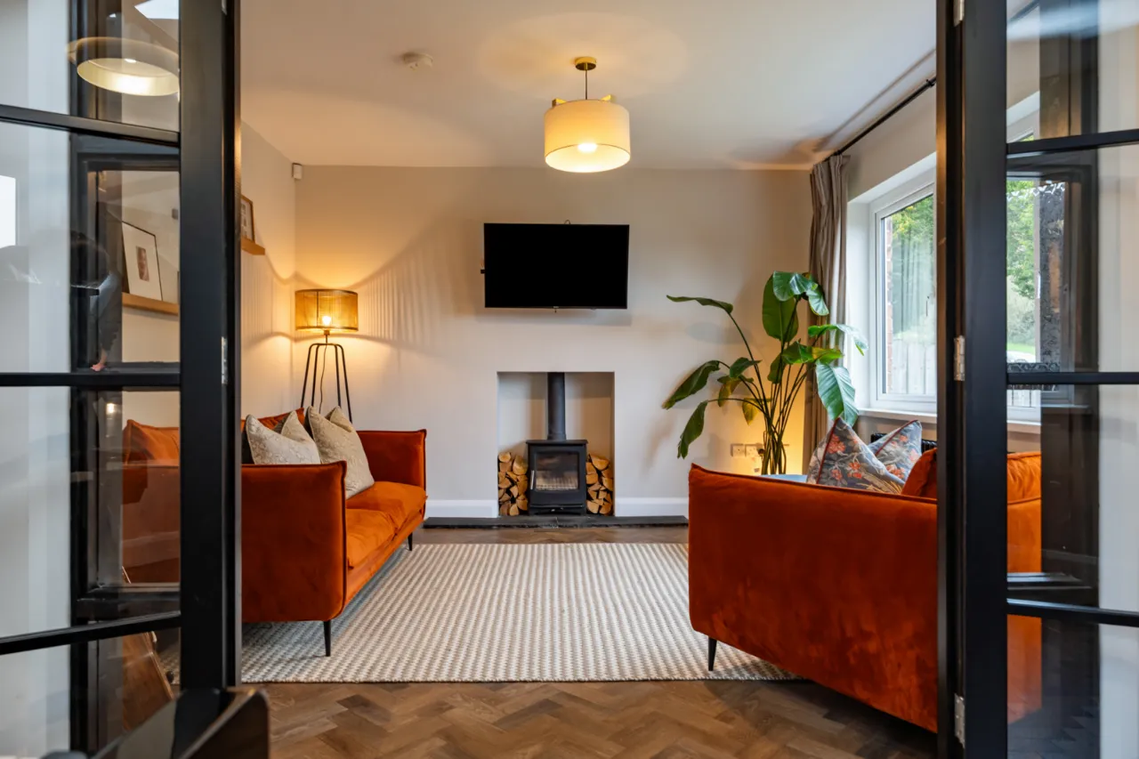 Crittall doors leading to bright and airy front lounge. Feature wood burning stove and views over Cavehill country park.