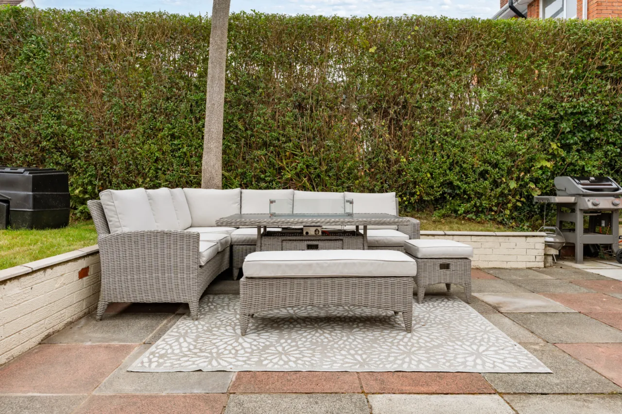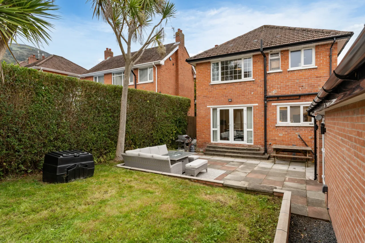 South /West facing rear garden laid in lawn, patio area, fully enclosed with bordering fencing, hedges and walls. Outside light and tap. Views over Cavehill.