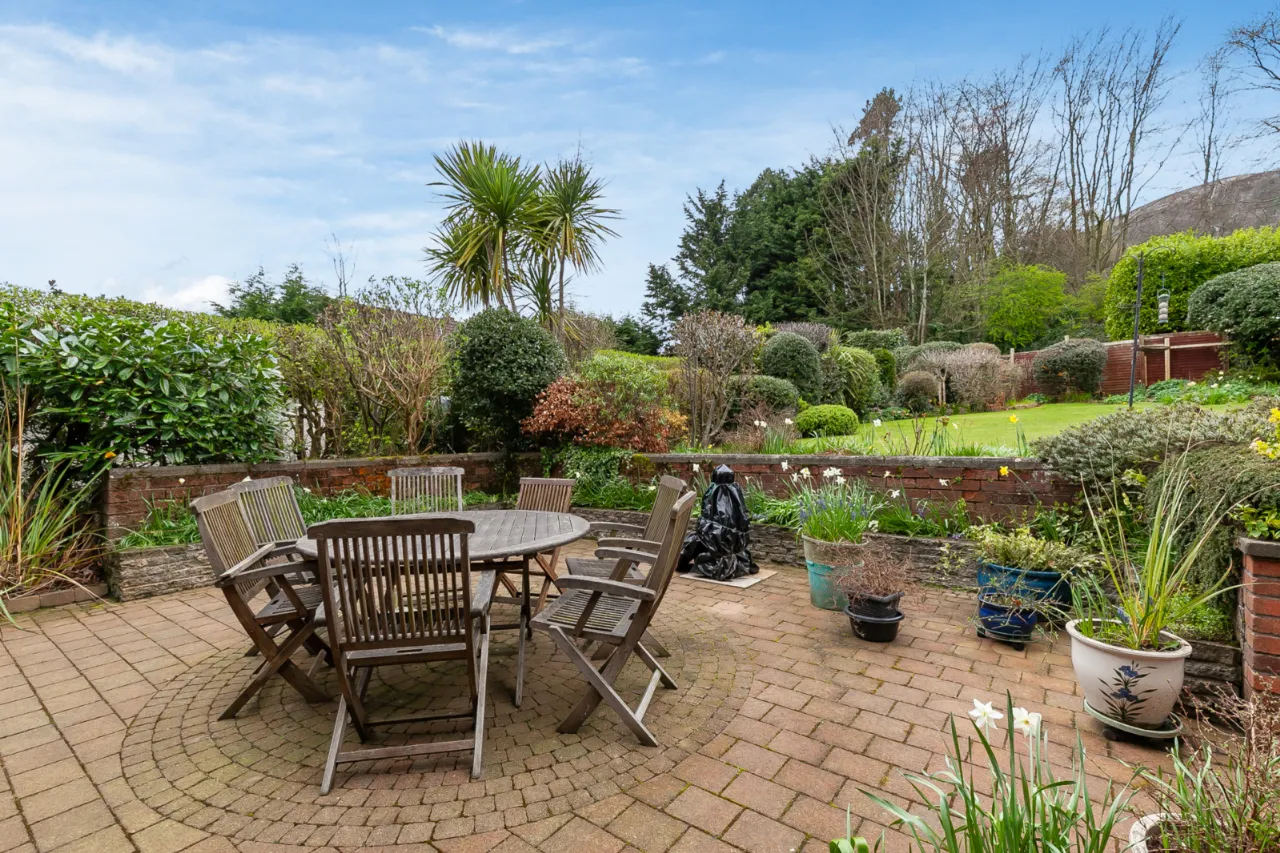 Paved patio area, landscaped rear garden laid in lawn, excellent privacy, pleasant range of shrubbery, hedging, flower beds and trees. Outside tap and security light.
