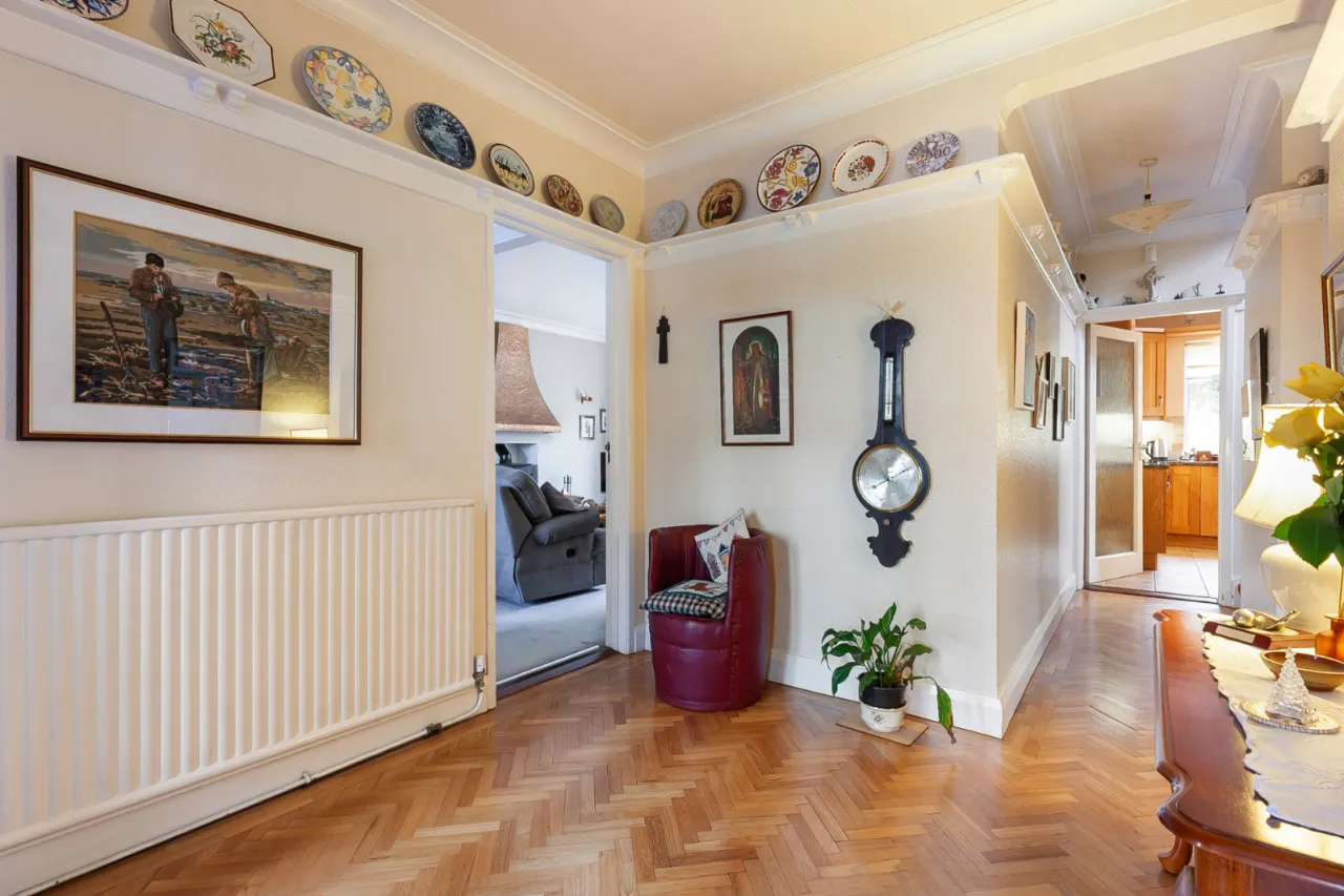 Herringbone wooden floor, plate rail, corniced ceiling and under stair storage.