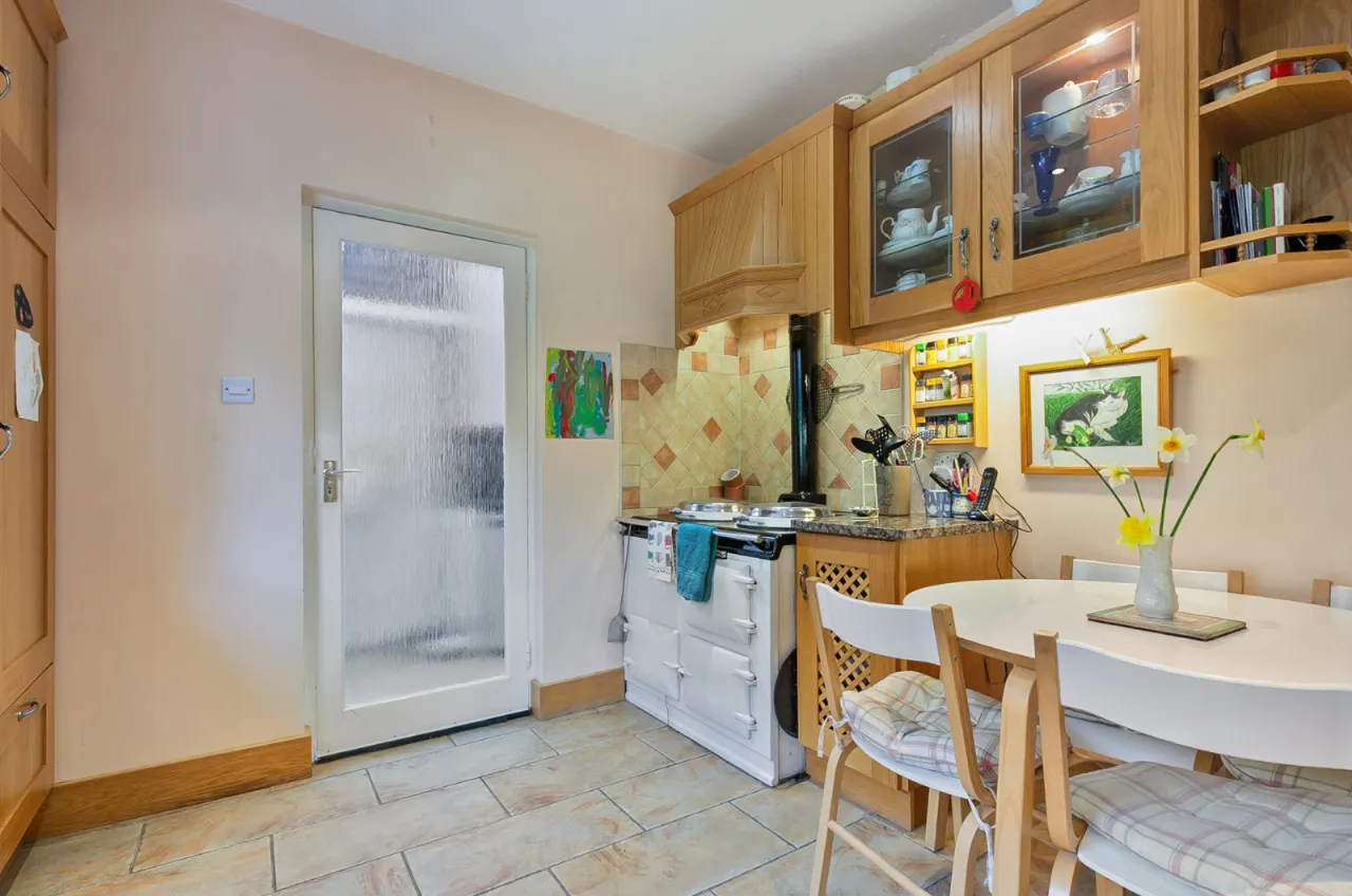 Comprises of a range of high and low level wooden units, with granite worktops, one and a half bowl sink unit with mixer taps and drainer. Integrated dishwasher, fridge and freezer, four ring hob with overhead extractor unit, feature oil Aga with double oven and hobs. Casual dining space, tiled floor, partly tiled walls, recessed lights and beautiful views over rear garden.