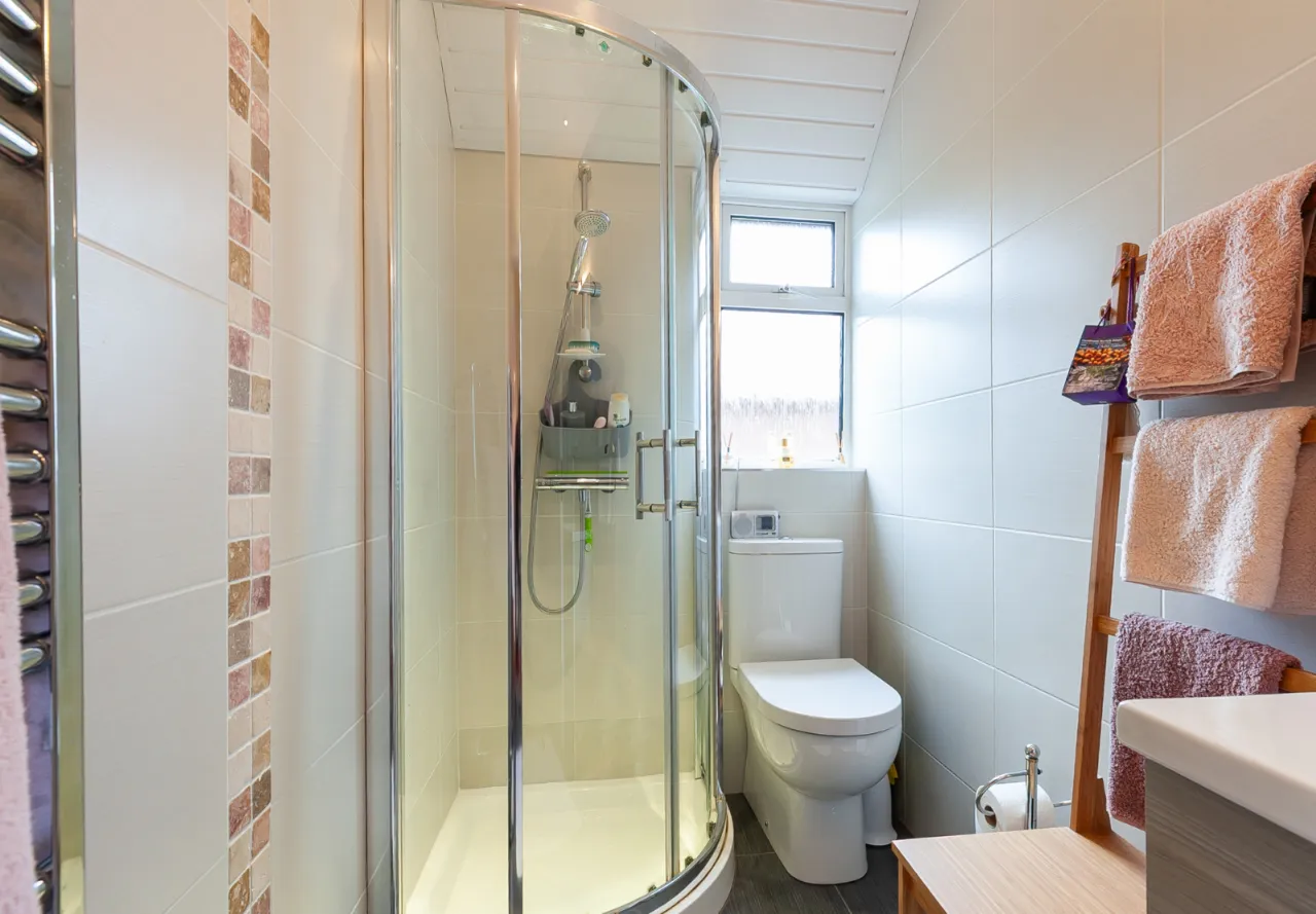 Enclosed corner shower unit with shower screen, ceramic bowl sink unit with mixer tap and vanity storage underneath. Chrome heated towel rail, fully tiled walls, tiled floor, recessed lighting and extractor fan.