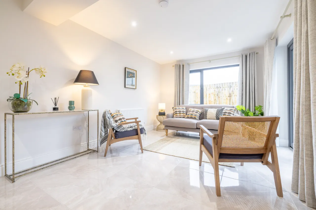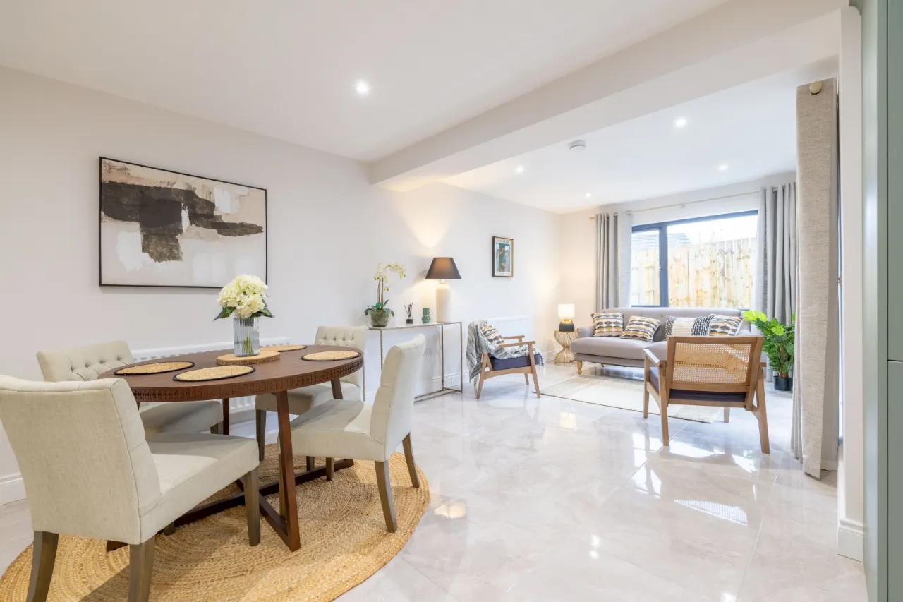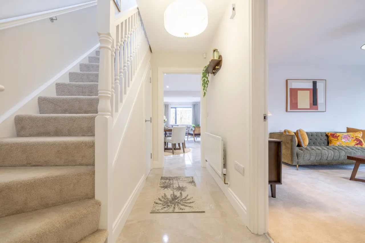 Ceramic wall tiling between kitchen units Porcelain tiled floor to kitchen/dining area, utility, hall, bathroom, en-suite and WC