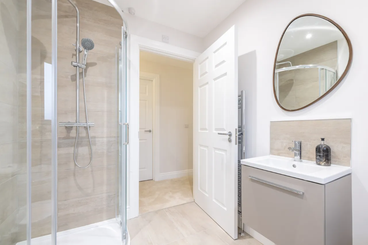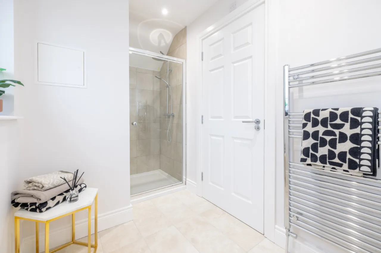 Separate shower enclosure with thermostatically controlled shower where applicable