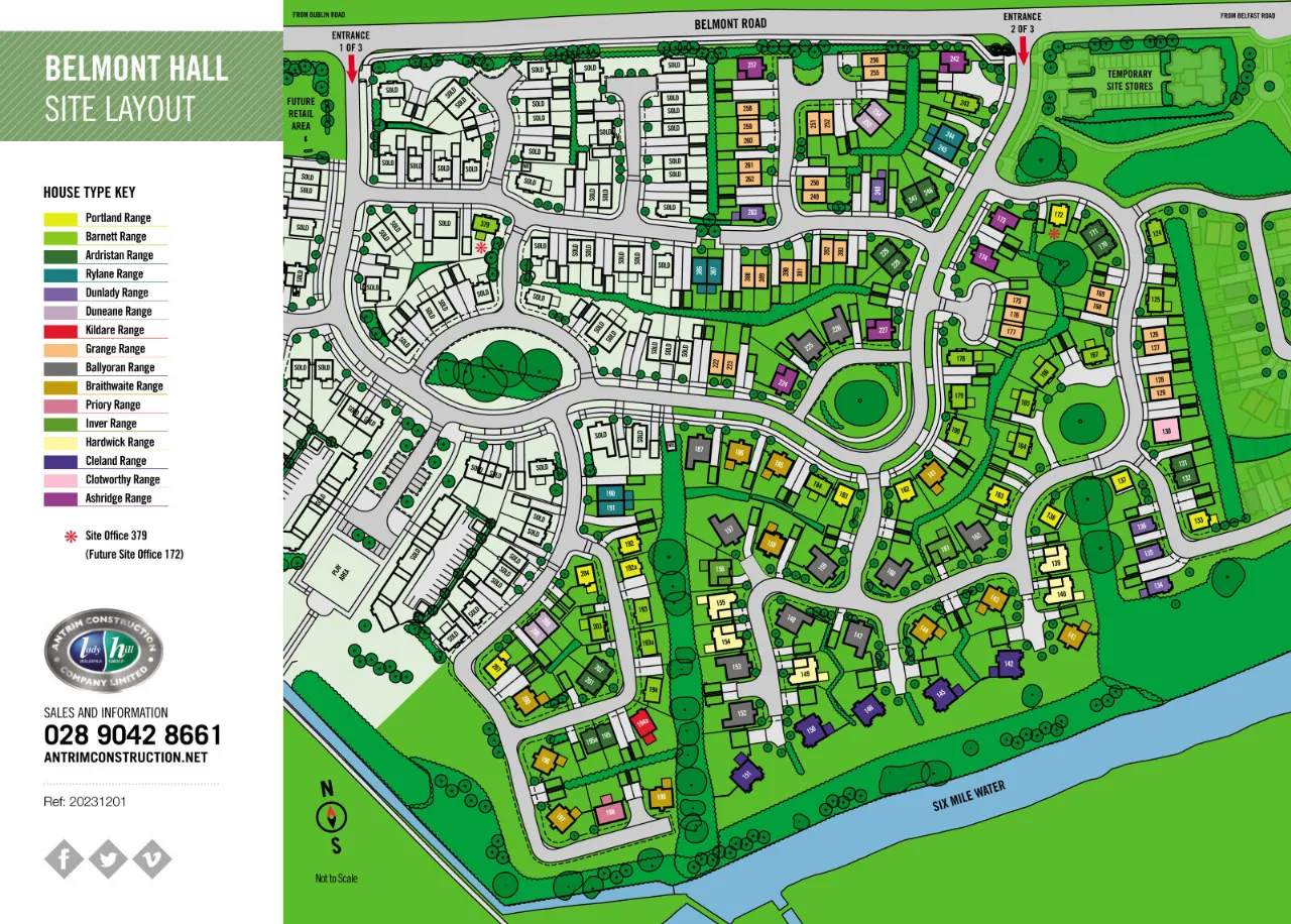 Imagine living in true natural beauty a mere 30 minutes from Belfast, just beyond Antrim town. With stillness, flowing water and lush green landscapes on your doorstep, Belmont Hall is a new neighbourhood development that combines excellent design in a perfect natural location. This environmentally sensitive neighbourhood offers immediate access to a network of parks, playing fields, and walks, all within a short distance of the Six Mile Water. Three separate entrances will service the development with a carefully crafted design of private cul-de-sacs and landscaped pedestrian pathways creating a relaxing, natural, environment. Schools, leisure facilities and shopping, a hospital and the international airport are all in close proximity. Stay connected with the nearby bus and rail links and the main arterial routes from South Antrim to the city.