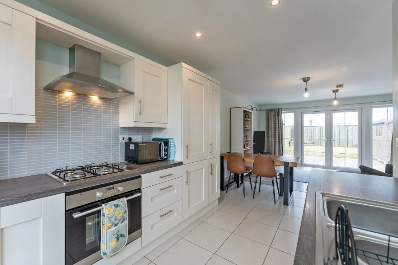 Modern fitted kitchen with a range of integrated appliances and spacious dining area
