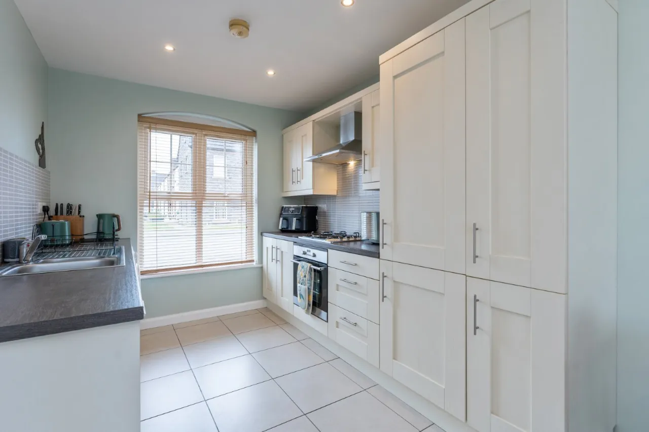 Modern fitted kitchen with excellent range of units, work surfaces, single drainer sink unit, integrated dishwasher, electric oven and four-ring gas hob, stainless steel extractor fan, integrated fridge freezer, plumbed for washing machine, storage understairs with gas boiler. Open to: