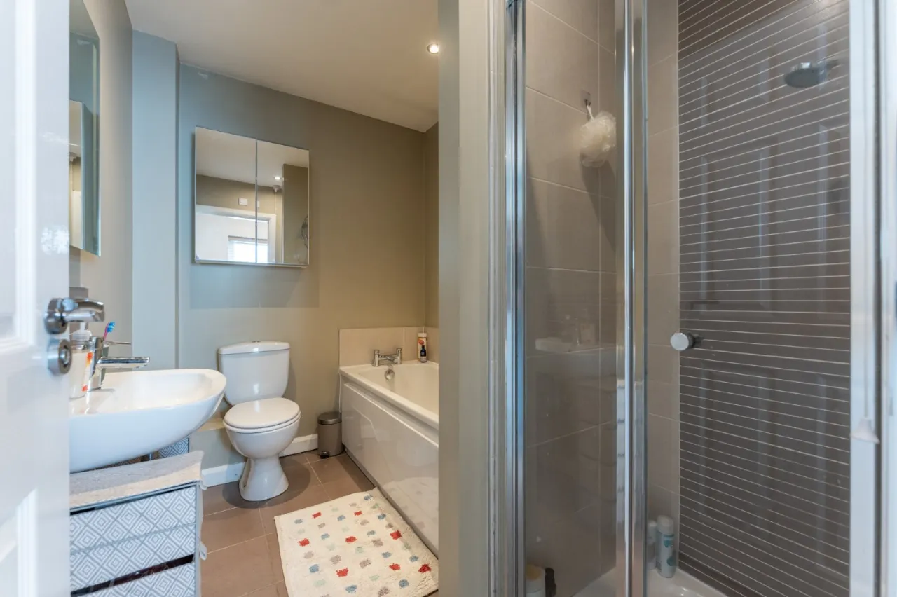 Modern suite comprising WC, paneled bath with mixer tap, corner shower cubicle, ceramic tiled floor, part tiled walls and extractor fan.