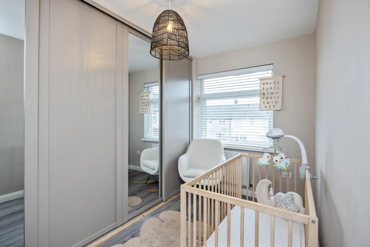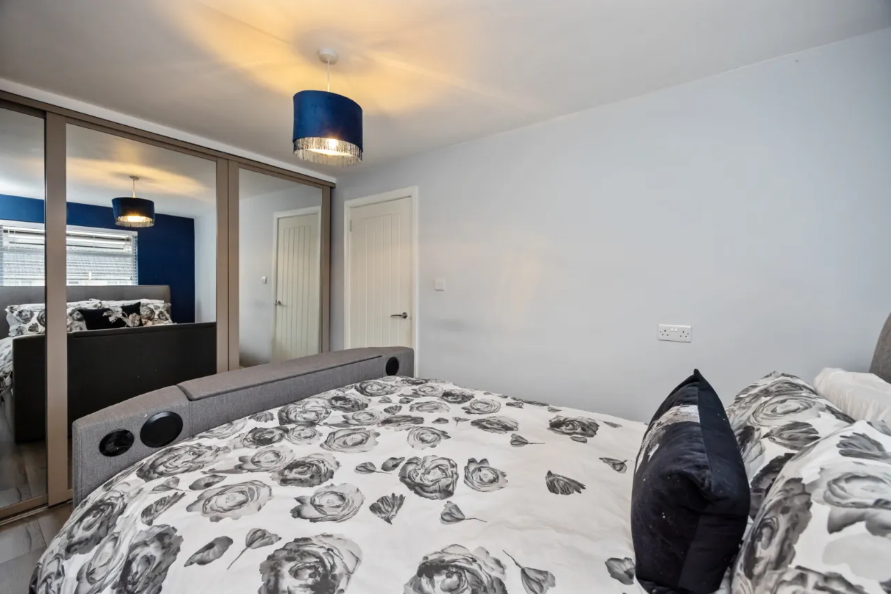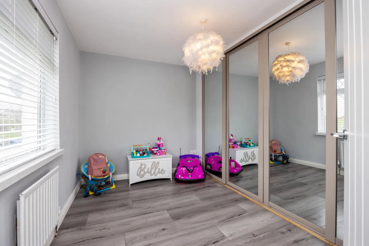Built in wardrobes with mirrored sliding doors, wood laminate floor.
