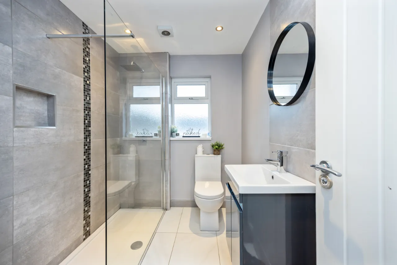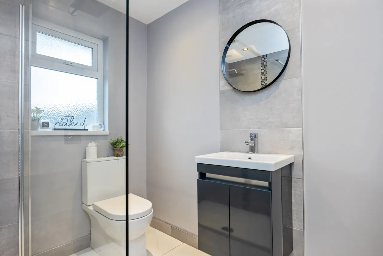 Fully tiled shower cubicle with overhead rain shower, low flush WC, vanity sink unit, ceramic tiled floor, chrome towel radiator.