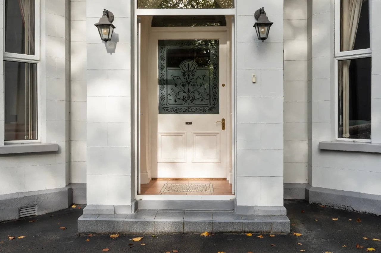 Tiled floor, hardwood inner door with detailed glazed inset.