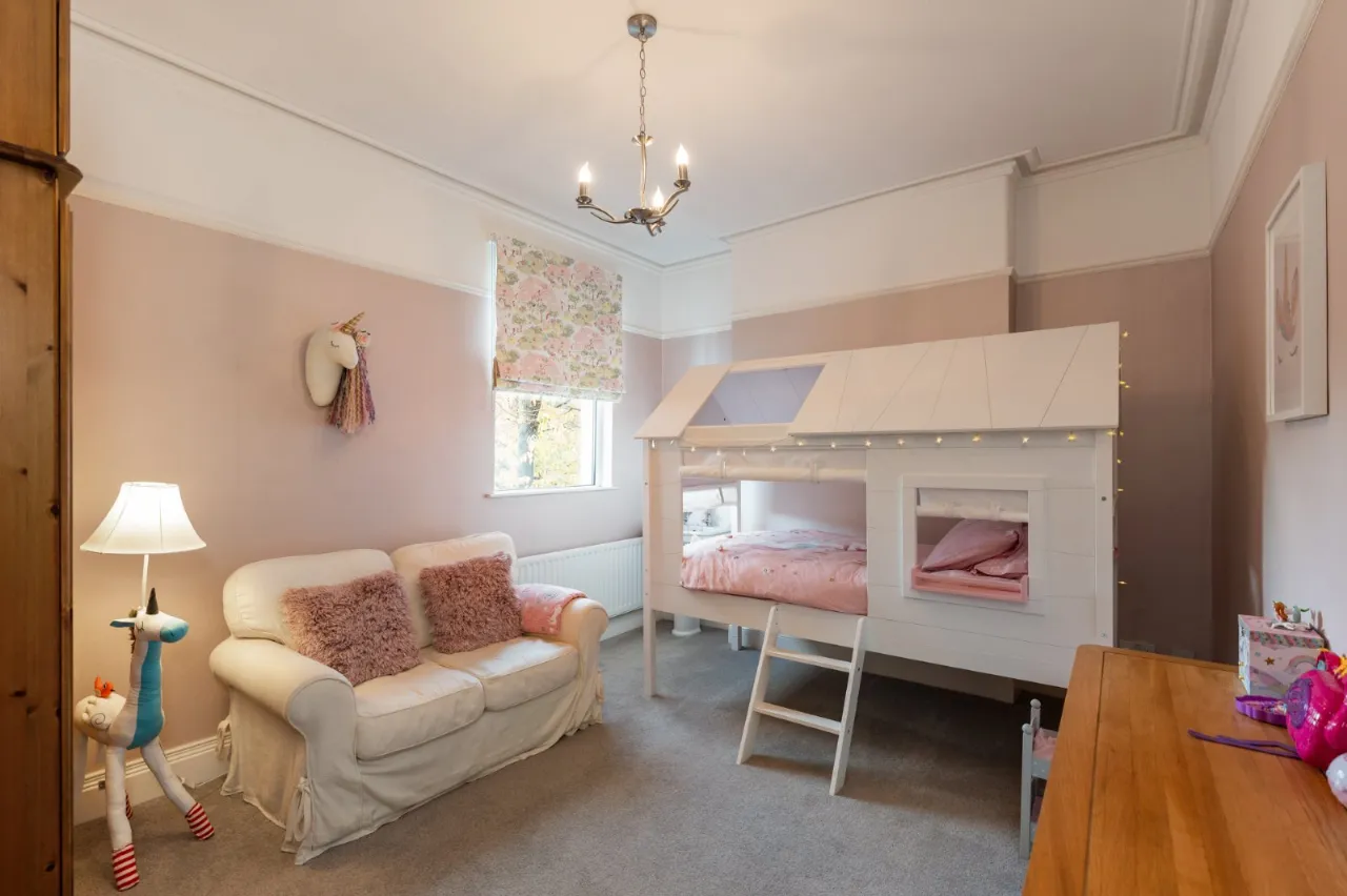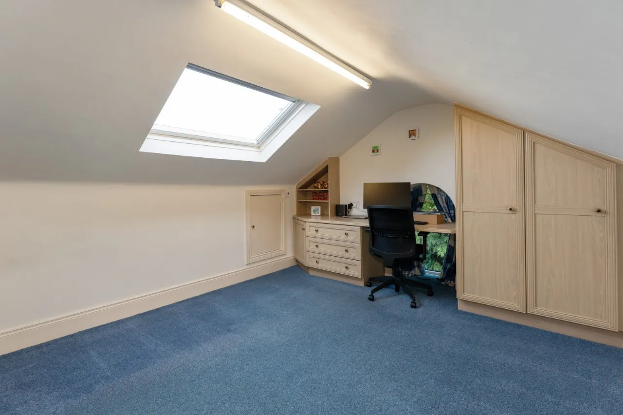 Large eaves storage, fitted drawers into eaves, fitted desk and wardrobe, velux window.