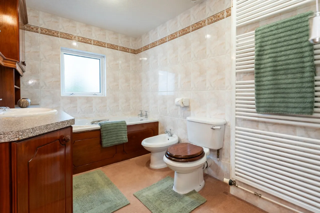 piece suite comprising of low flush WC, bidet, wash hand basin with vanity unit, panelled jet bath, tiled shower with Mira instant heat electric shower, heated towel radiator, fully tiled walls.
