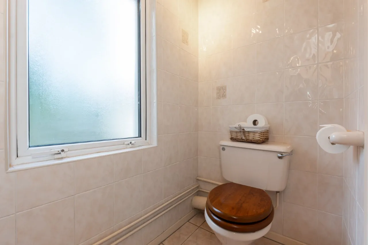 Low flush WC, pedestal wash hand basin, tiled floor, fully tiled walls.